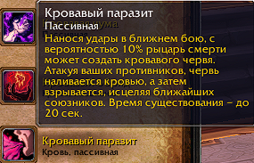 1)У нас черви не взрываються а просто исчезают...занижен процент появления червей....занижено хп червей 2)(Нанося удары в ближнем бою, с вероятностью 10% рыцарь смерти может создать кровавого червя. Атакуя ваших противников, червь наливается кровью, а затем взрывается, исцеляя ближайших союзников. Время существования – до 20 сек). должно быть 20% хп от уровня максимального здоровья Рыцаря Смерти черви должны взрываться либо после их смерти, либо после 20 секунд и хилить в процентах от своих хп в зависимости от набранного бафа undefined. Например, при 10 стаков отхилит на 100% от хп червя |