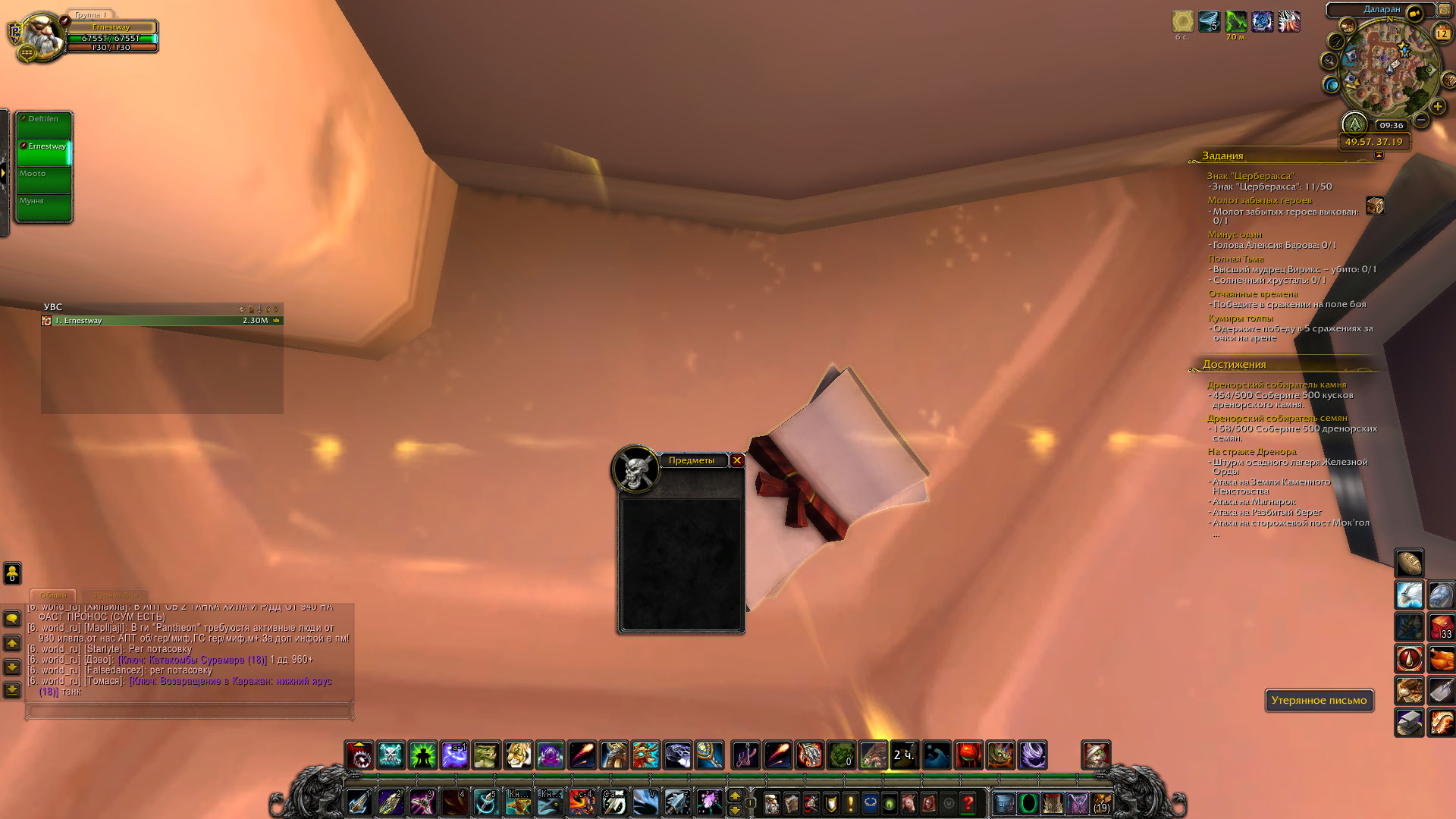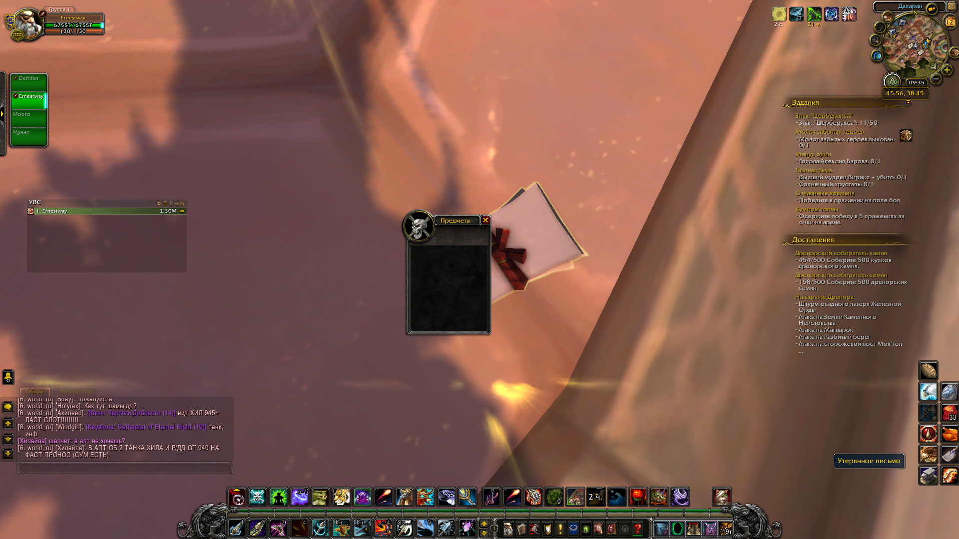 https://www.curseforge.com/wow/addons/btw-quests-legion/download/2579240 https://www.curseforge.com/wow/addons/btw-quests/download/2580238 подходящая для наших серверов версия аддона , скачивать надо оба файла, распаковывать в папку /Addons в клиенте. Другие подобные аддоны не мешают. Поможет быстрее найти на каком квесте цепочки Ваш персонаж был грубо остановлен. зы. у меня на воине письмо подбиралось раньше многократно, можно было взять квест с него, но сдавать было некому. Потом починили хозяйку черного рынка. Квесты первый и второй получилось сдать... и все. Должно было бы прийти по почте приглашение от почтмейстера. Но не пришло. аддон показывает критерий продолжения цепочки , который не выполнен. И соответственно, на почте делать нечего, следующих квестов нет. Это к тому, что может когда то сдали и осталось висеть в ожидании, пока что то придет почтой. Вот и забылось. |