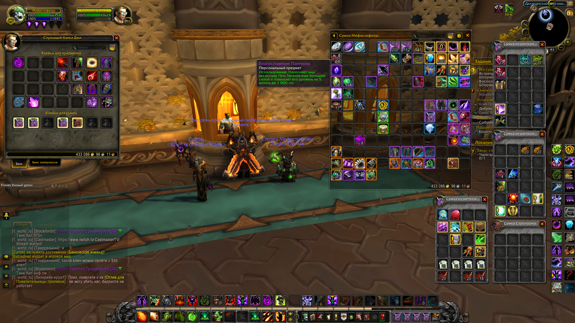 | Description | На данный момент, у меня накопилось 14 благословений пантеона. Ссылаясь на статистику моих твинков, Данных с официального сервера, и сайте https://www.mmo-champion.com/threads/2353109-Drop-rate-statistics-for-Amanthul-s-Vision-and-other-Pantheon-trinkets , Аксессуар пантеона мне должен был выпасть со 100% шансом на 9 неделе. | ||||