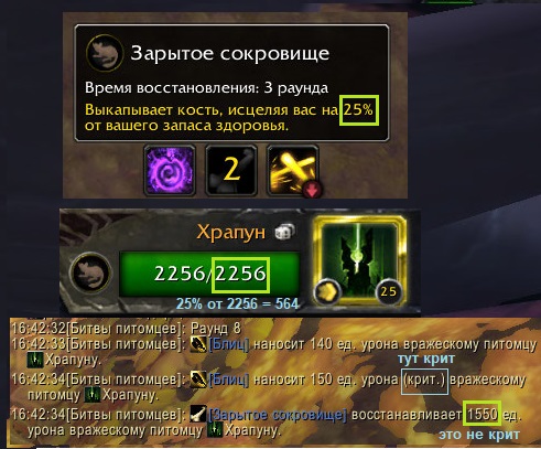 | Description | пет Храпун https://ru.wowhead.com/npc=128014 скилл Зарытое сокровище https://ru.wowhead.com/pet-ability=578 при хп НПС 2256 отхиливает 1550 хп (не крит) в комментариях вовхеда пишут что хилит 30% вместо описанных 25, но даже так получается многовато пруфы на скрине | ||||