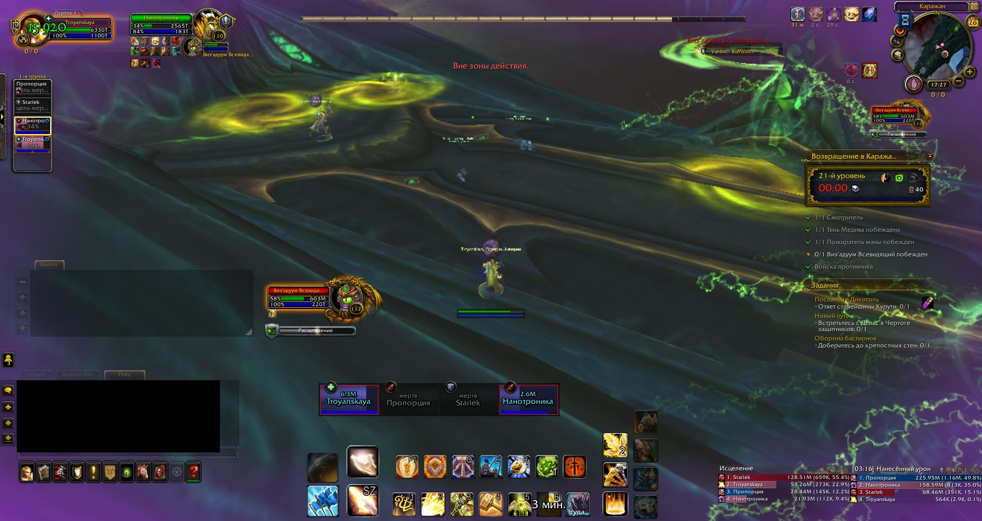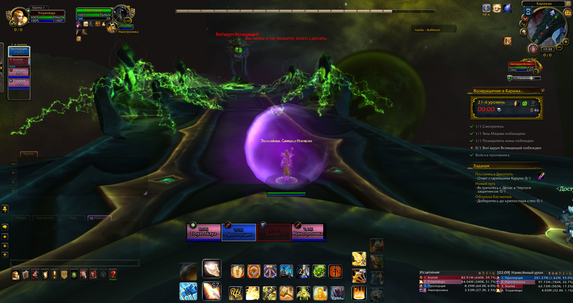 DescriptionНе первый раз сталкиваюсь с такой проблемой. Дело в том, что на последнем боссе Виз'Адуум, после его перехода на второй корабль, сперва на мне багается купол, в котором игроков переносит на вторую фазу. Затем, пока с других товарищей в моей группе шар уже скинулся, я до сих пор нахожусь в нем, при этом скорость моего передвижения почему-то увеличивается, будто я все еще в этом шаре. После того, как купол все же спадает и я пытаюсь прохилить группу, мне пишет мол "Цель вне поля зрения" , хотя вот они все бегают передо мною. В итоге пати падает, и такое случалось несколько раз подряд.
