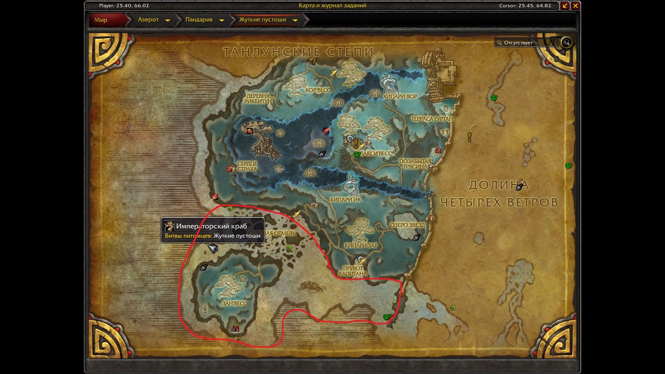 | Description | Добрый день! Невозможно получить данное достижение https://ru.wowhead.com/achievement=6589/%D1%81%D0%B0%D1%84%D0%B0%D1%80%D0%B8-%D0%BF%D0%BE-%D0%BF%D0%B0%D0%BD%D0%B4%D0%B0%D1%80%D0%B8%D0%B8 , т.к. отсутствует моб https://ru.wowhead.com/npc=65203/%D0%B8%D0%BC%D0%BF%D0%B5%D1%80%D0%B0%D1%82%D0%BE%D1%80%D1%81%D0%BA%D0%B8%D0%B9-%D0%BA%D1%80%D0%B0%D0%B1 , облетел все места согласно вовхеду(обвел на скрине), но так его и не нашел, одни зверьки(не боевые питомцы). Если моб заселен, но не на своем месте (аналогично https://ru.wowhead.com/npc=62905/%D0%BC%D1%8B%D1%88%D1%8C-%D0%BD%D0%B0%D0%B3%D0%BE%D1%80%D1%8C%D1%8F согласно вовхеду в основном водится в сумеречном нагоье, но ее там попросту нету, зато в штормхейме их тьма тьмущая), подскажите тогда его местоположение. | ||||