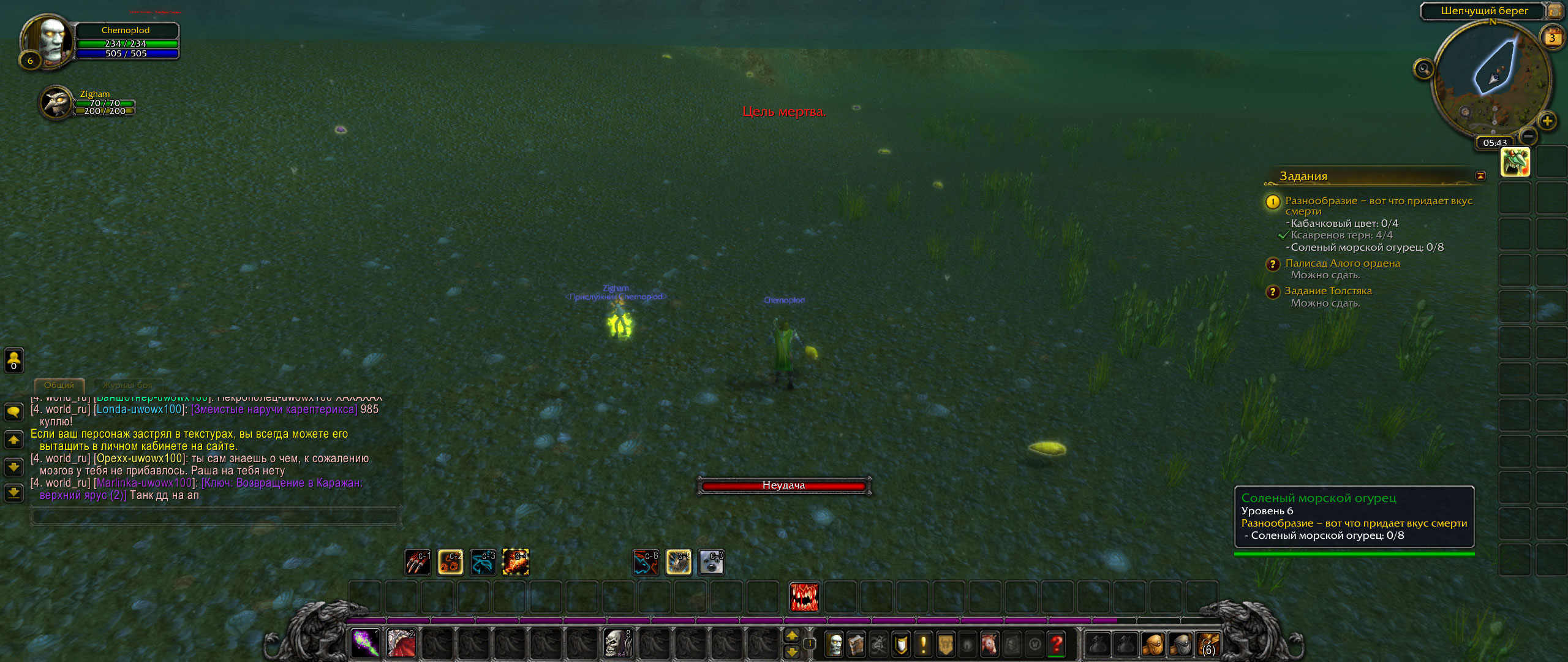 | Description | Для прохождения квеста "Разнообразие - вот что придает вкус смерти" (https://ru.wowhead.com/quest=24976/) необходимо собрать 3 ингредиента, один из них - "Соленый морской огурец" (https://ru.wowhead.com/item=52068) - не поднимается, в процессе сбора возникает "Неудача" по причине : "Цель мертва" | ||||