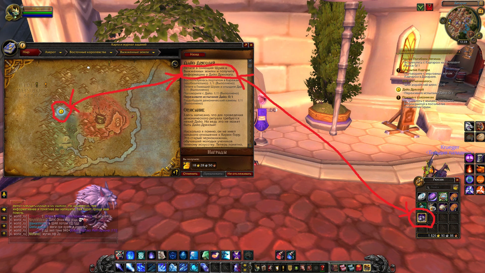 | Steps To Reproduce | Летите в Гниющий Шрам в Выжженных землях и получите информацию у Дайо Дряхлого. 1)Воспользуйтесь порталом в Каражан 2)Летите в Гниющий Шрам и отыщите Дайо 3)Поговорите с Дайо 4)Переживите испытание Дайо 5)Демонический камень | ||||