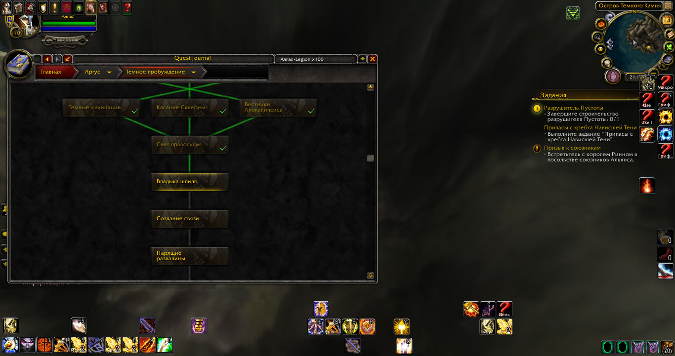 Спасибо за ответ. Стал проверять всю цепочку квестов на аргусе и обнаружил, что не выполнены более ранние квесты. Нашёл проблемную точку. Не могу взять квест Владыка шпиля https://ru.wowhead.com/quest=47993/владыка-шпиля. На карте четко виден восклицательный знак, а NPC Верховный экзарх Туралион , который должен дать этот квест, неактивен. Предыдущий квест свет правосудия https://ru.wowhead.com/quest=47992/свет-правосудия выполнен и сдан. Скрины прилагаю. Кстати, Спасибо за аддон Btwquest. Я потратил около получаса , чтобы своими силами обнаружить эту проблемную точку. С помощью аддона Btwquest я это сделал за несколько секунд. |