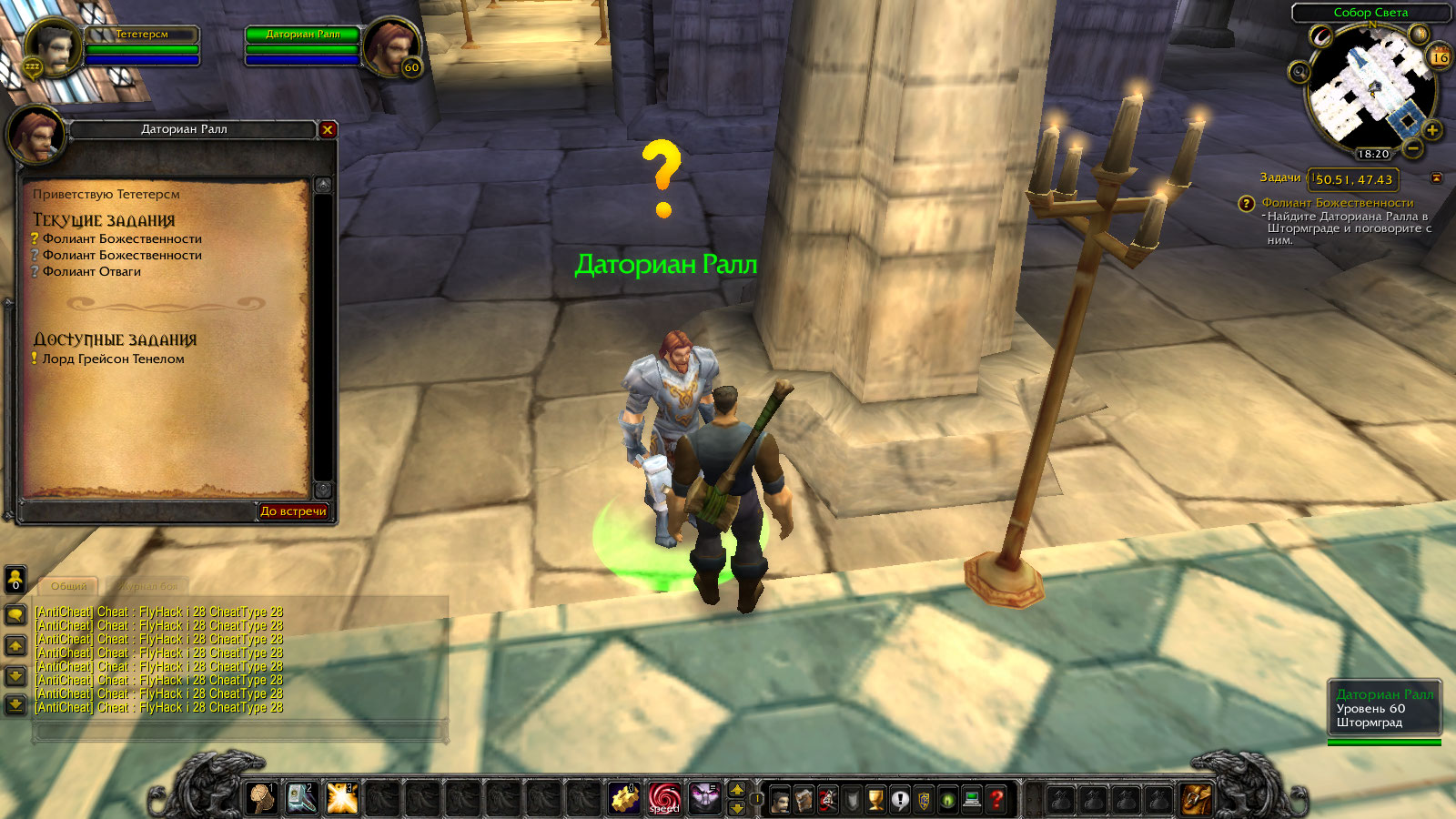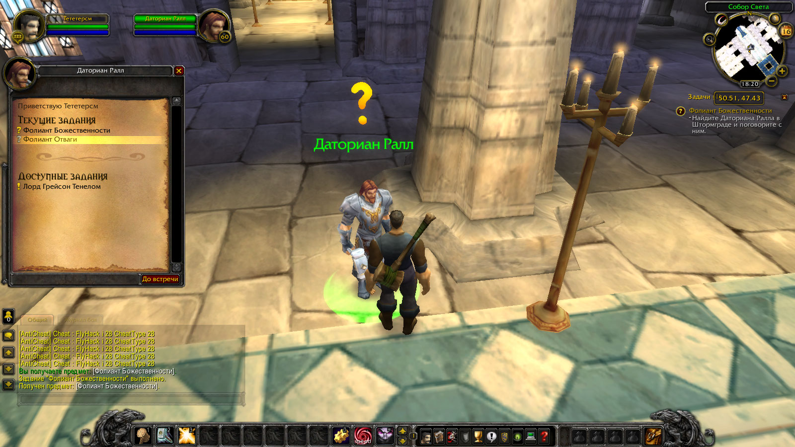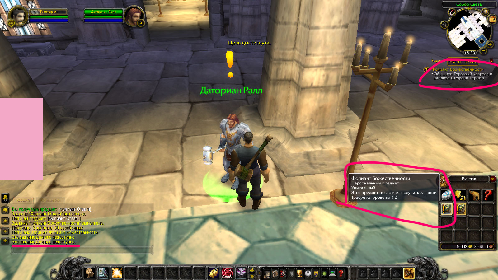 | Description | Как только берешь квест https://ru.classic.wowhead.com/quest=1642 и идешь его сдавать тебе дают книгу https://ru.classic.wowhead.com/item=6775/ которая должна давать квест на продолжение цепочки. у нас же она не дает ничего и даже после окончания цепочки кв просто остается в инвентаре мертвым грузом. К тому же сразу сдается еще один квест, чего тоже быть не должно. Это путает. Вот видео цепочки квестов и скриншоты того что происходит у нас https://www.youtube.com/watch?v=NXdhZjT02rI | ||||