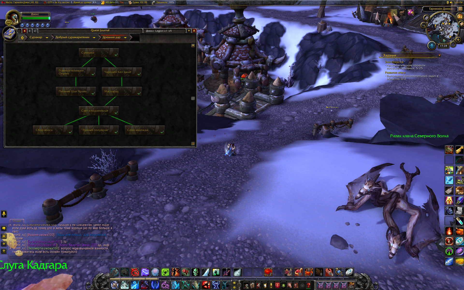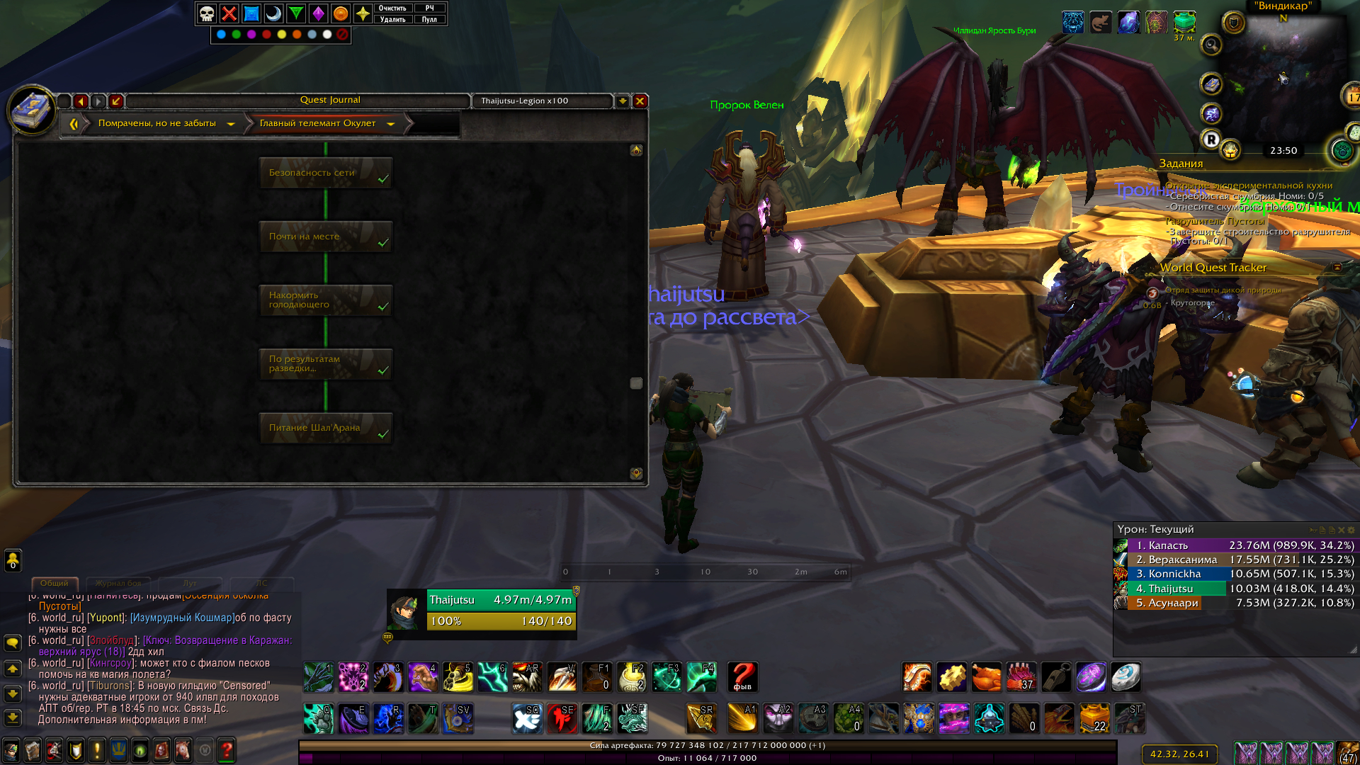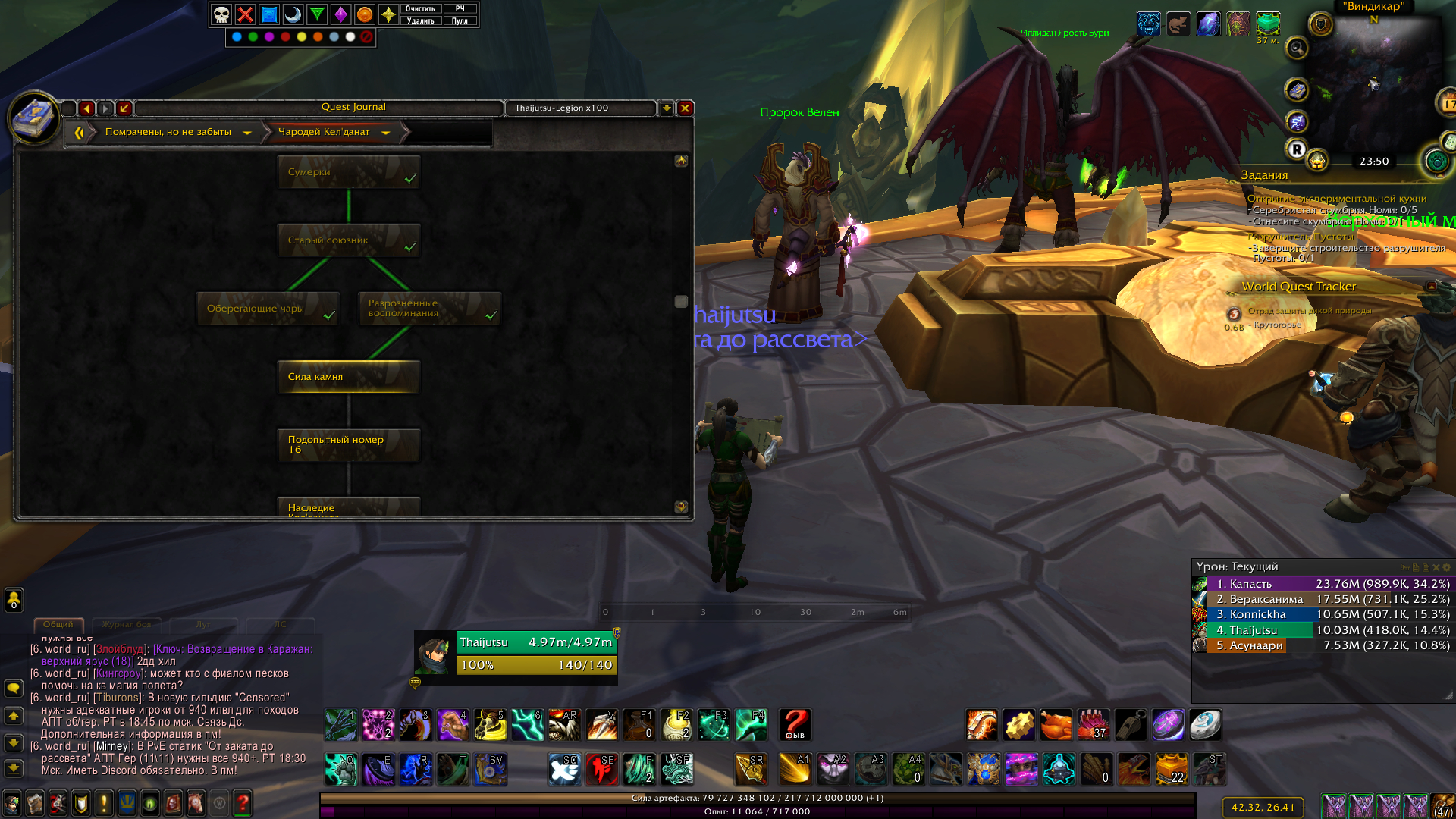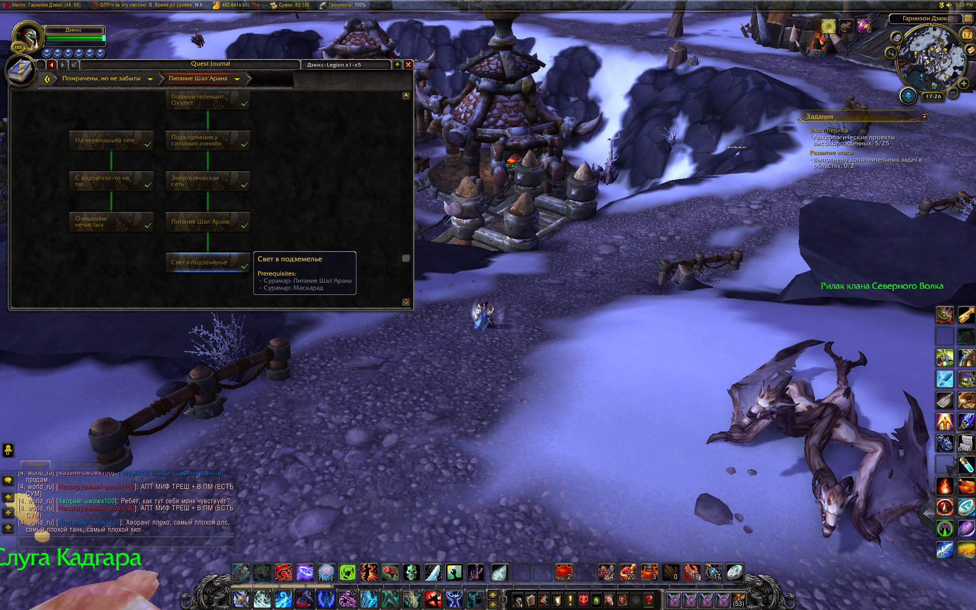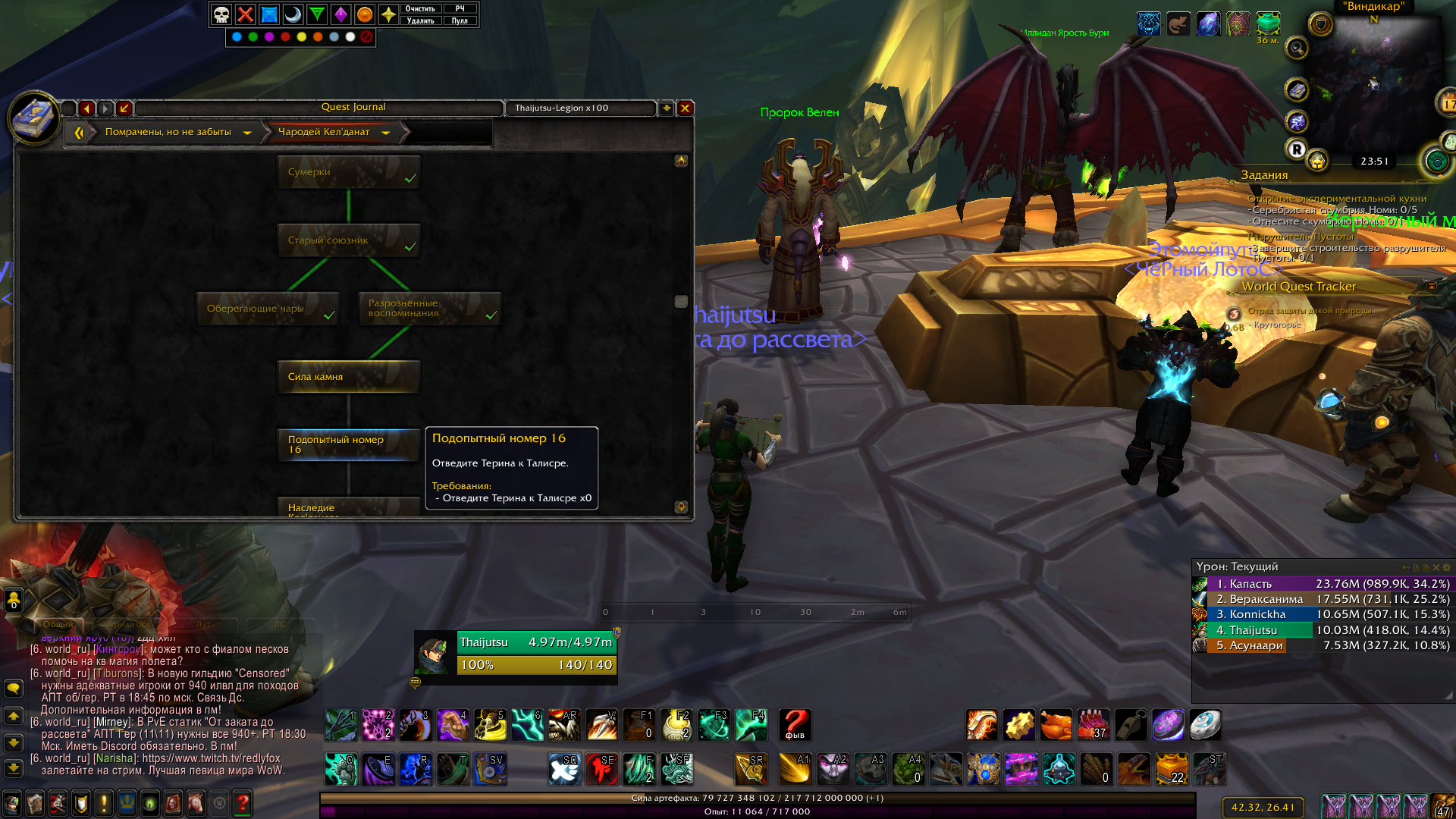 Скачайте и установите один или оба аддона для проверок квестовых цепочек. https://www.curseforge.com/wow/addons/btw-quests-legion/download/2579240 https://www.curseforge.com/wow/addons/btw-quests/download/2580238 подходящая для наших серверов версия аддона , скачивать надо оба файла, распаковывать в папку /Addons в клиенте. Другие подобные аддоны не мешают. http://u90850je.bget.ru/wow/Questline_tester_1.3.rar This addon can help us with this problem Затем проверьте состояние Сурамара у Вас - я последовательно на своем персонаже открывал в первом аддоне цепочки Сурамара и делал скриншоты. Там хорошо видно, какая глава первой части сюжетки после какой главы становится доступна. Также на одном из скриншотов есть блоксхема зависимостей глав достижения "Помрачены , но не забыты". На ней видно, что глава, квест из которой Вам жаждется получить, становится доступна раньше, чем будет доступна к выполнению глава "Питание Шаларана". То есть можно сделать вывод, что Вы либо что то когда то забагали, либо квест, который Вам хочется у Вас уже выполнен. В общем, аддон Вам покажет, а Вы заскрините и покажете уже нам. |
