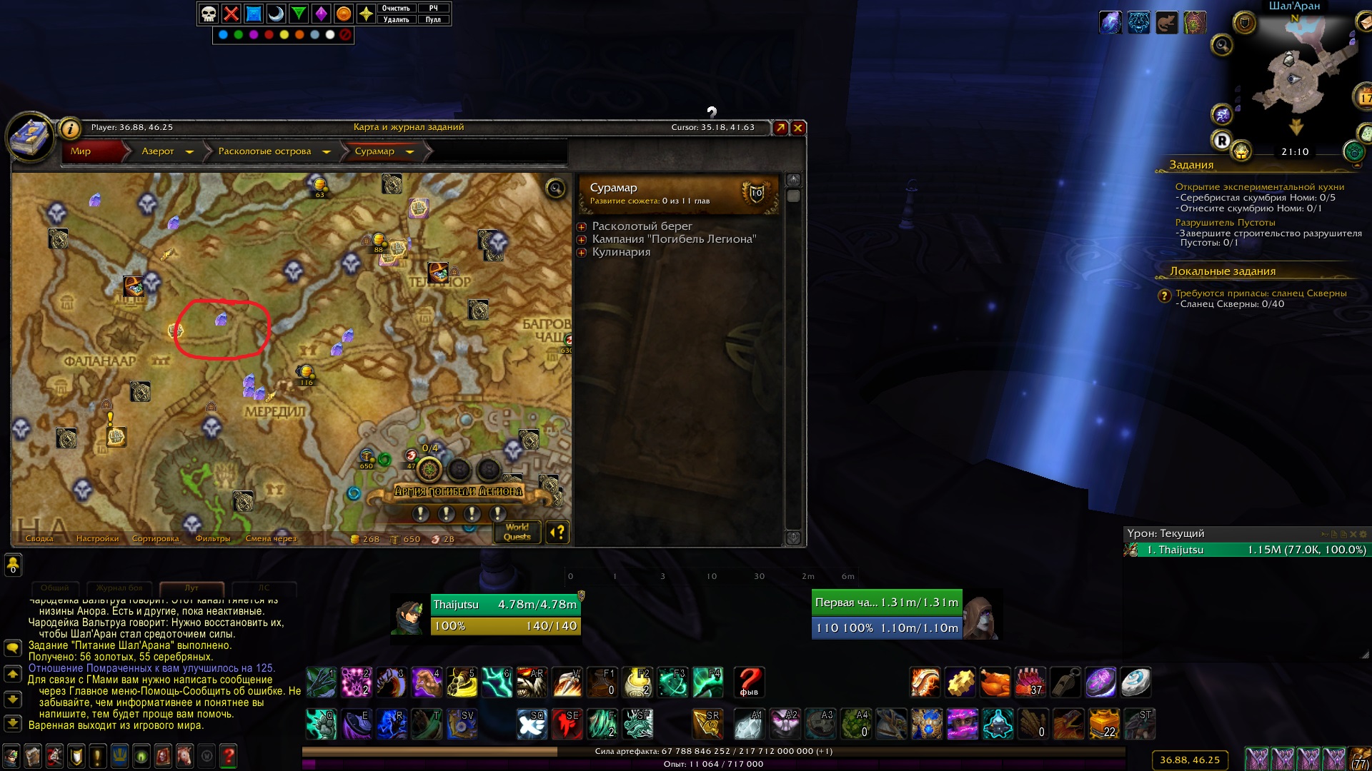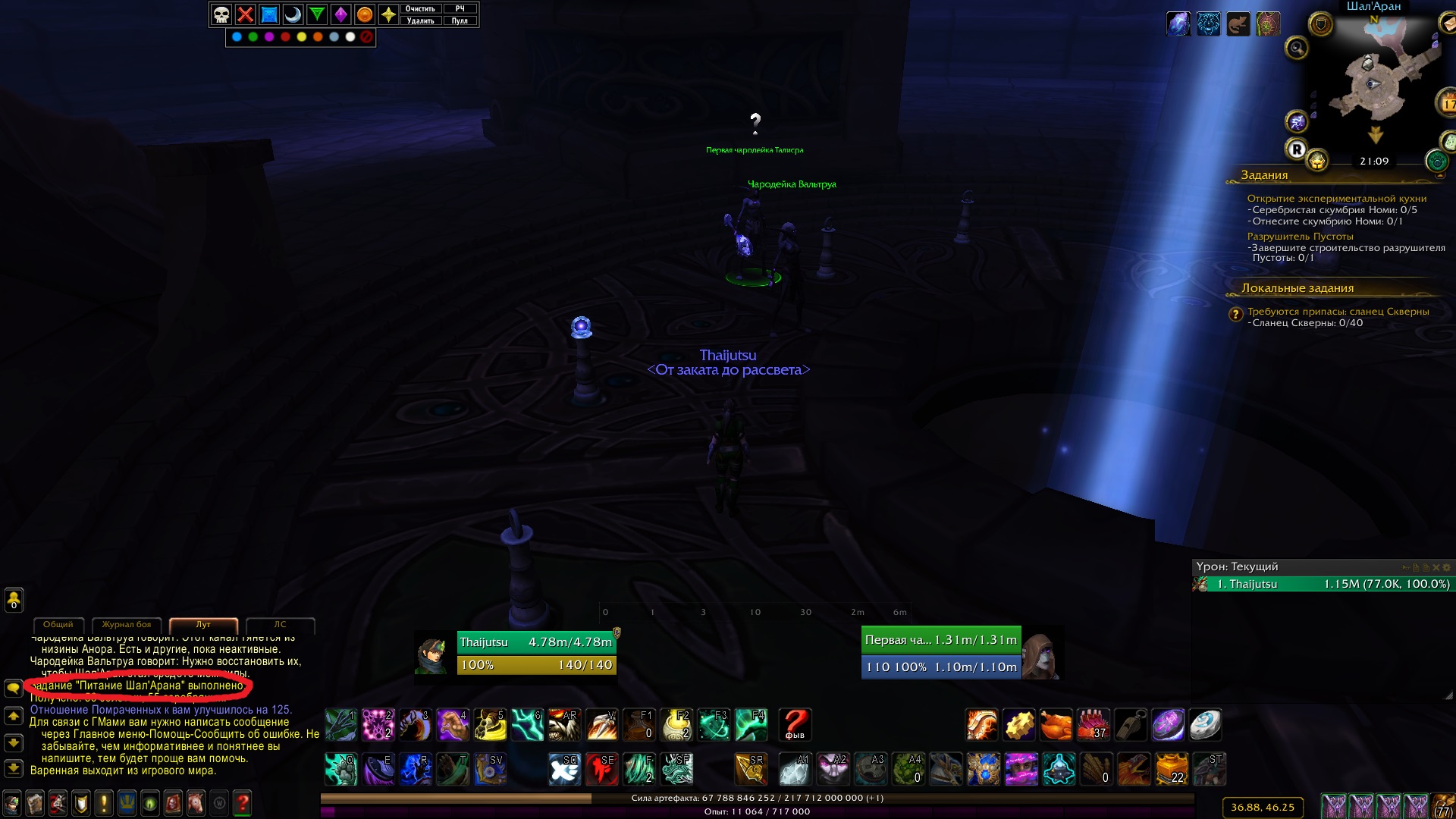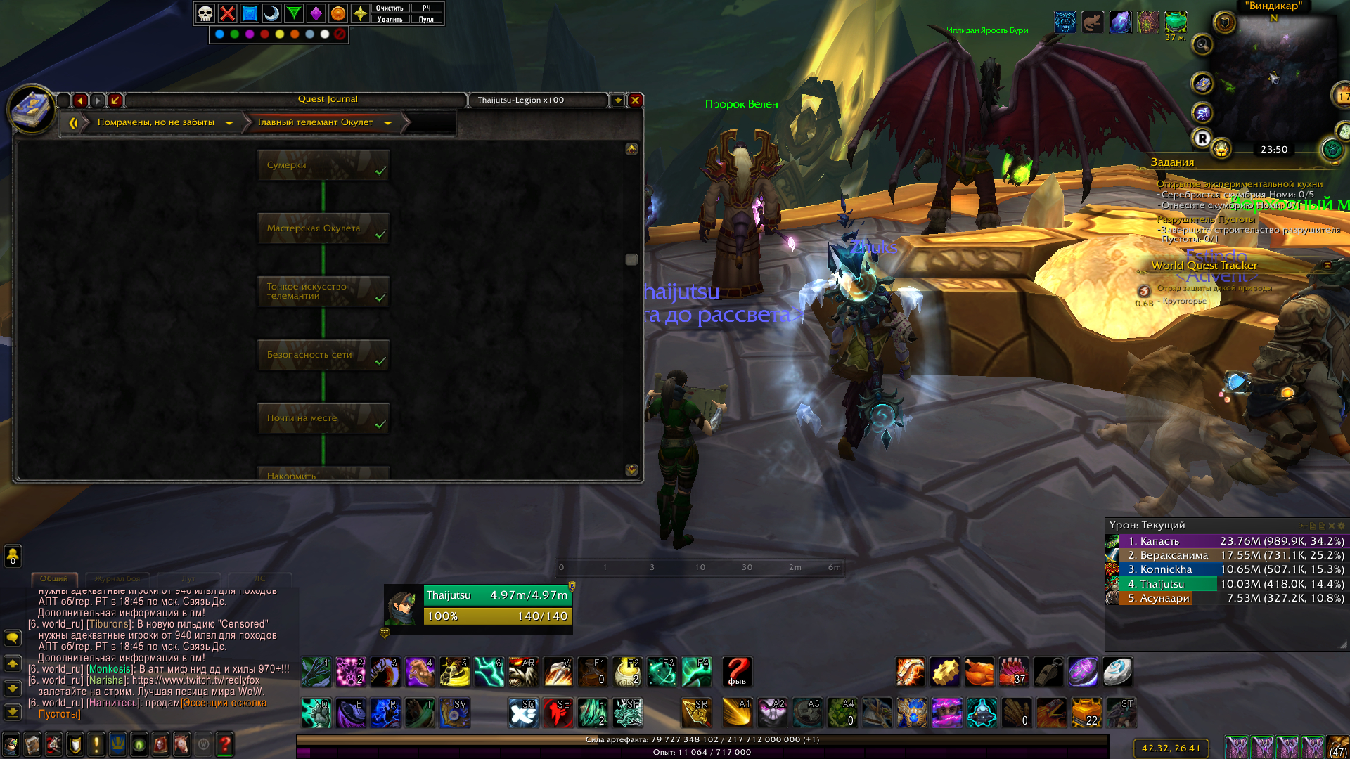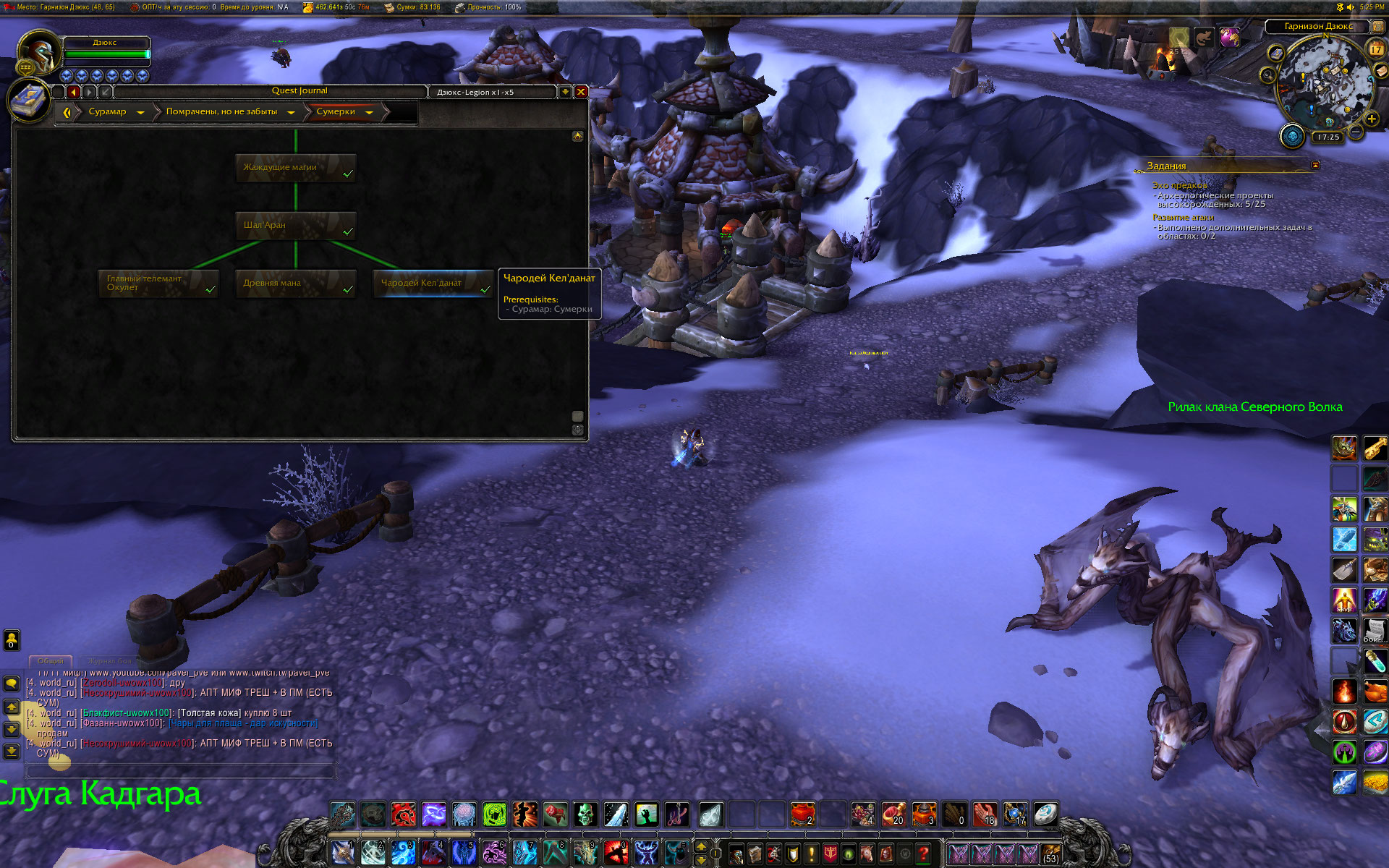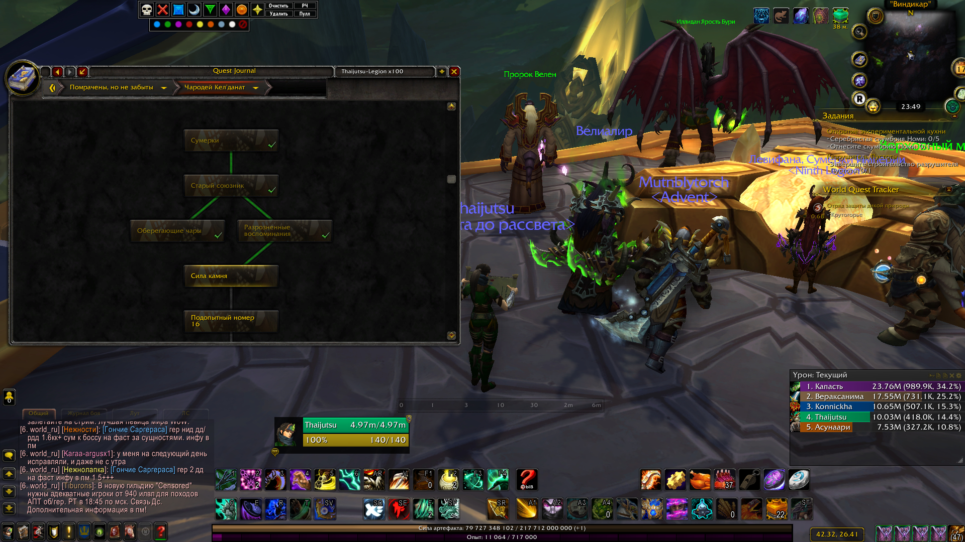Скачайте и установите один или оба аддона для проверок квестовых цепочек. https://www.curseforge.com/wow/addons/btw-quests-legion/download/2579240 https://www.curseforge.com/wow/addons/btw-quests/download/2580238 подходящая для наших серверов версия аддона , скачивать надо оба файла, распаковывать в папку /Addons в клиенте. Другие подобные аддоны не мешают. http://u90850je.bget.ru/wow/Questline_tester_1.3.rar This addon can help us with this problem Затем проверьте состояние Сурамара у Вас - я последовательно на своем персонаже открывал в первом аддоне цепочки Сурамара и делал скриншоты. Там хорошо видно, какая глава первой части сюжетки после какой главы становится доступна. Также на одном из скриншотов есть блоксхема зависимостей глав достижения "Помрачены , но не забыты". На ней видно, что глава, квест из которой Вам жаждется получить, становится доступна раньше, чем будет доступна к выполнению глава "Питание Шаларана". То есть можно сделать вывод, что Вы либо что то когда то забагали, либо квест, который Вам хочется у Вас уже выполнен. В общем, аддон Вам покажет, а Вы заскрините и покажете уже нам. |