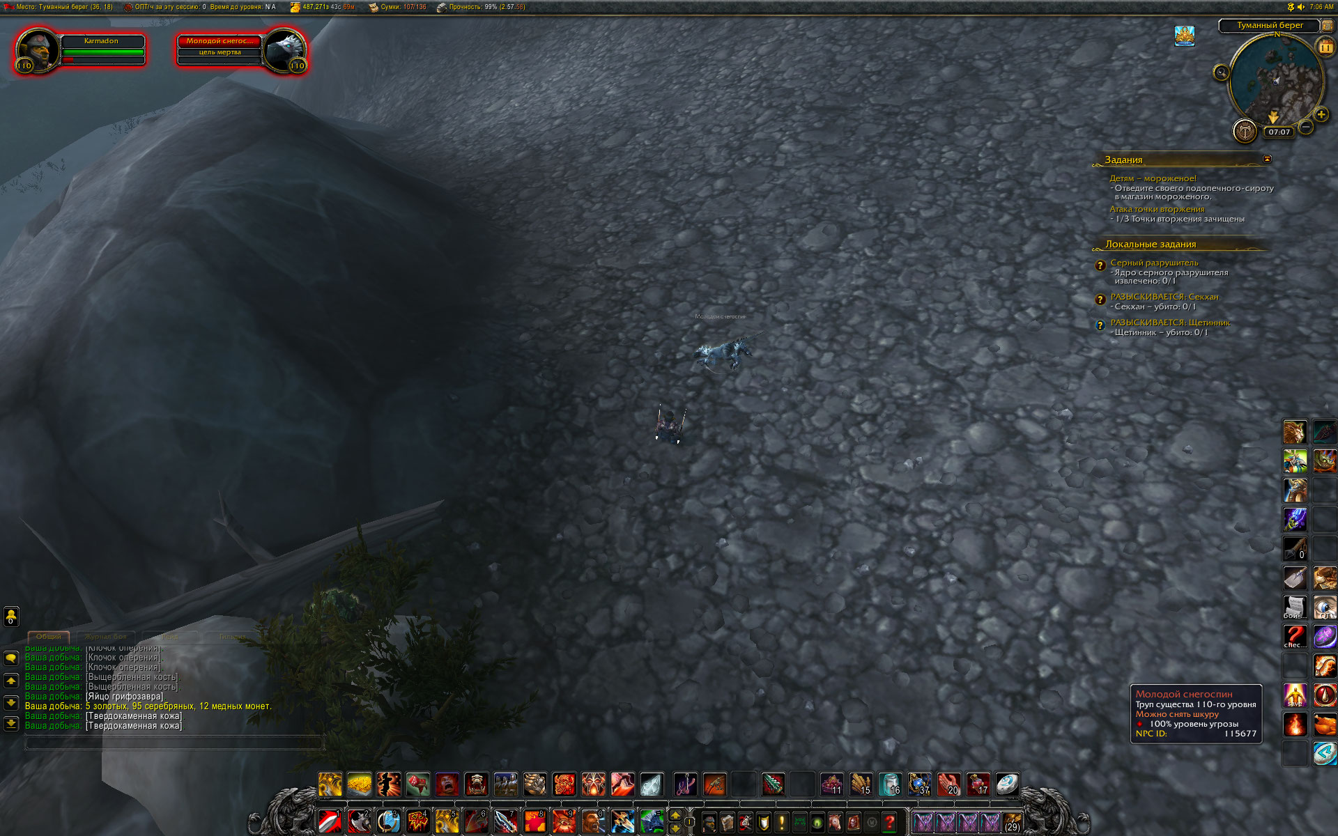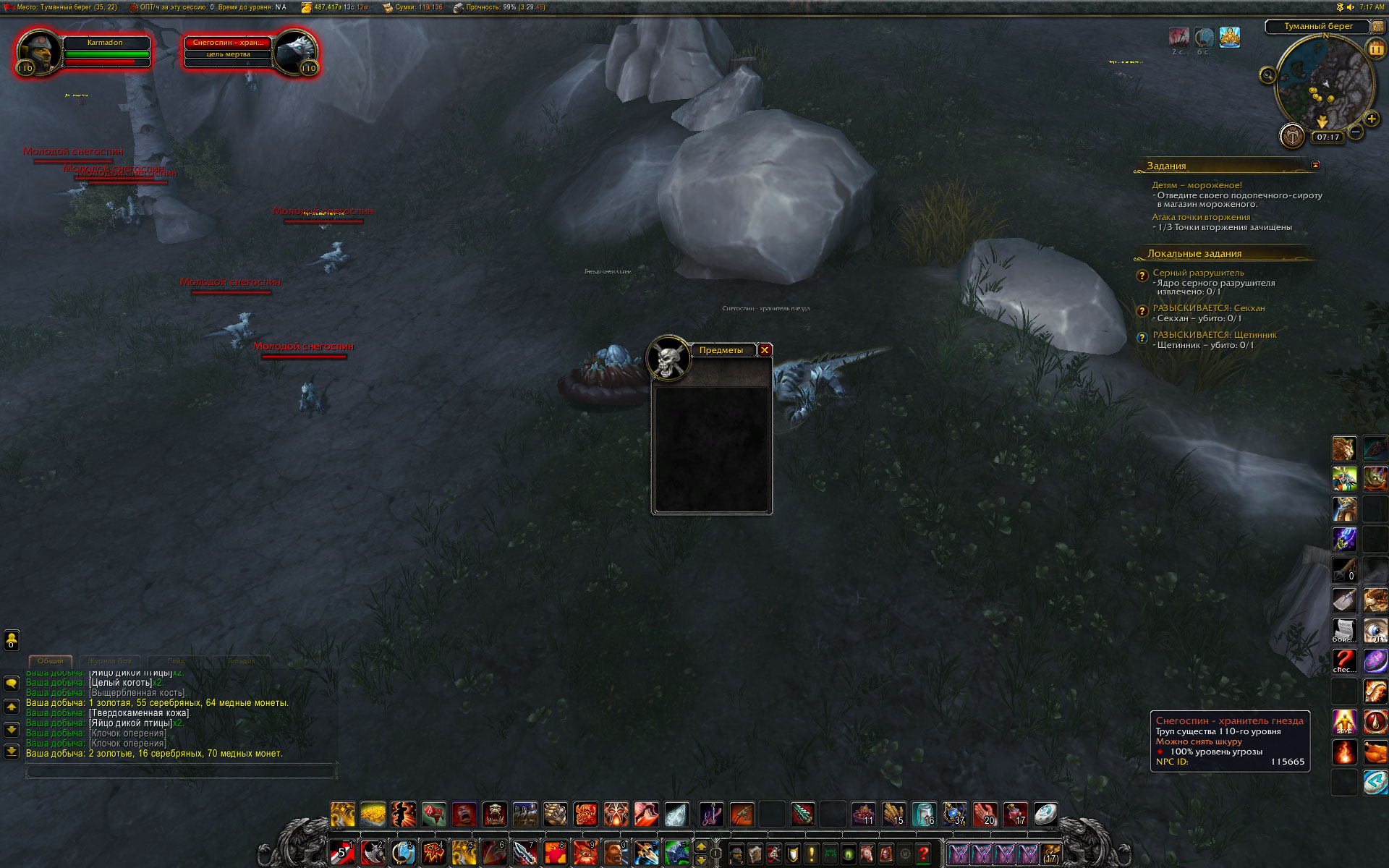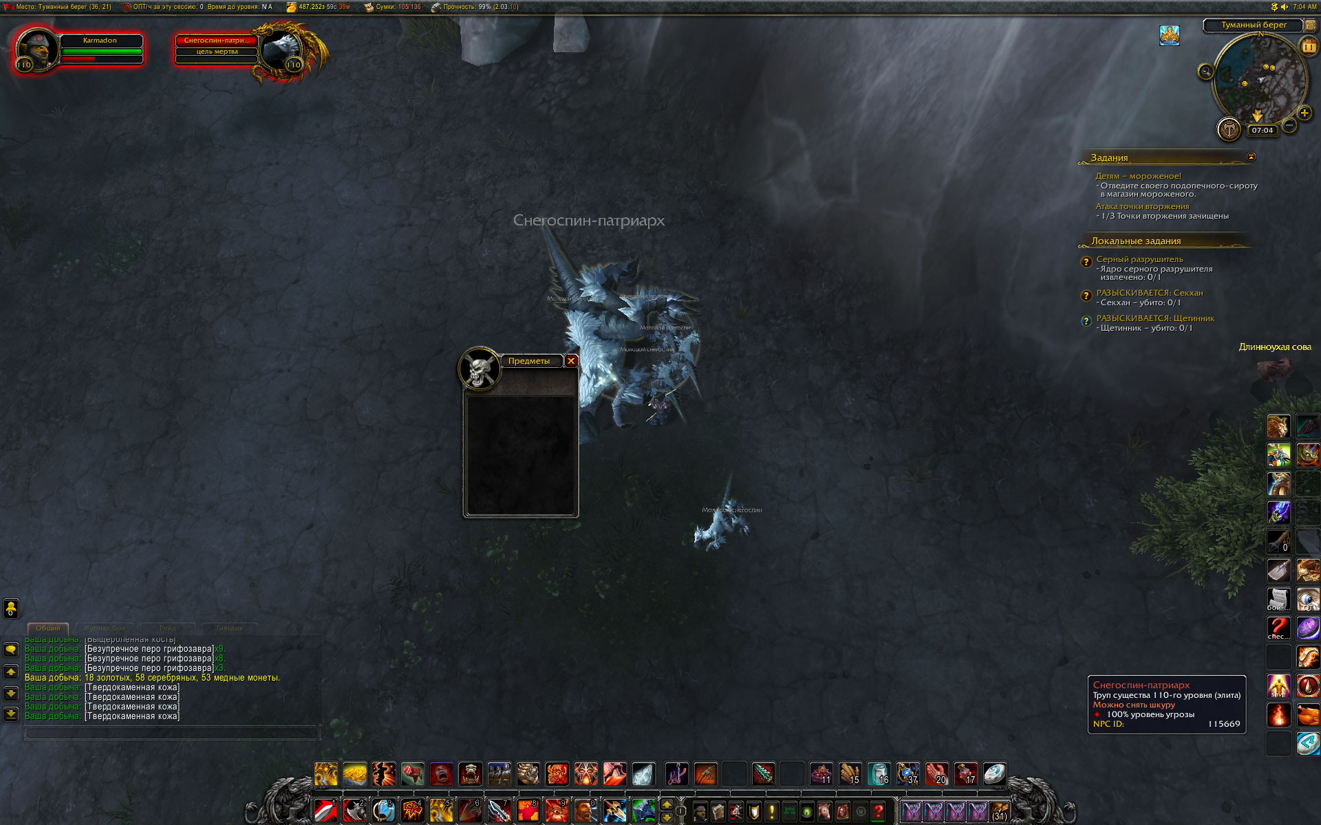 Дважды Снегоспин-патриарх. В одном случае убит в составе пака, в другом случае одиночный моб, массовый сбор добычи как бы не при чем.