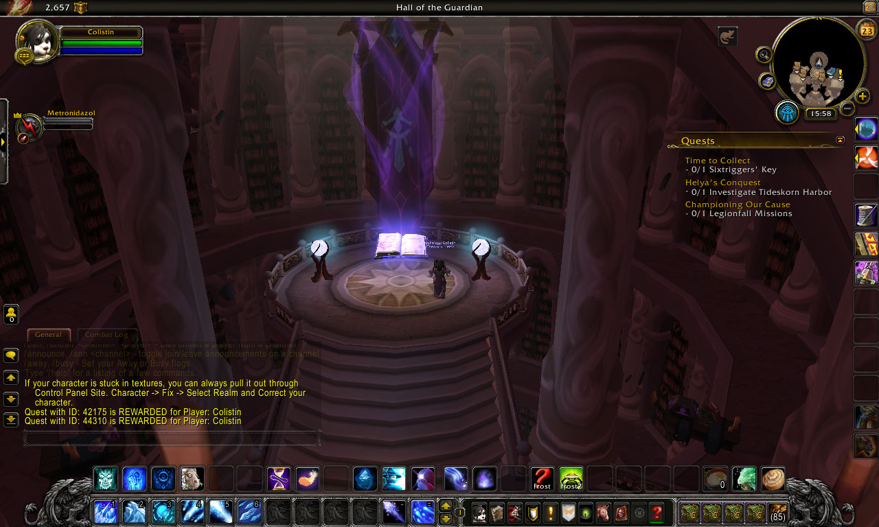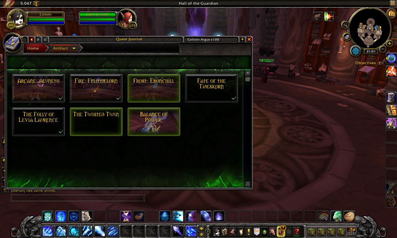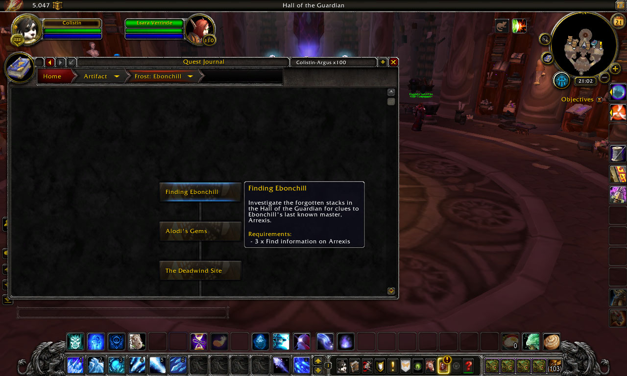 | Description | - I finished the Arcane and Fire artifact weapons chain quests, and the Frost one can;t be started..... - I completed A mage's weapon, selected the frost artifact (EBONCHILL) to pursue, and then no further quest.... https://www.wowhead.com/quest=41085/a-mages-weapon - the next quest should be ''Finding Ebonchill'' https://www.wowhead.com/quest=42452/finding-ebonchill (Meryl Felstorm doesn;t give the quest) - screenshots : | ||||