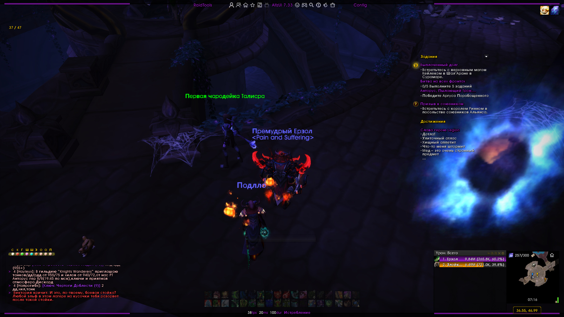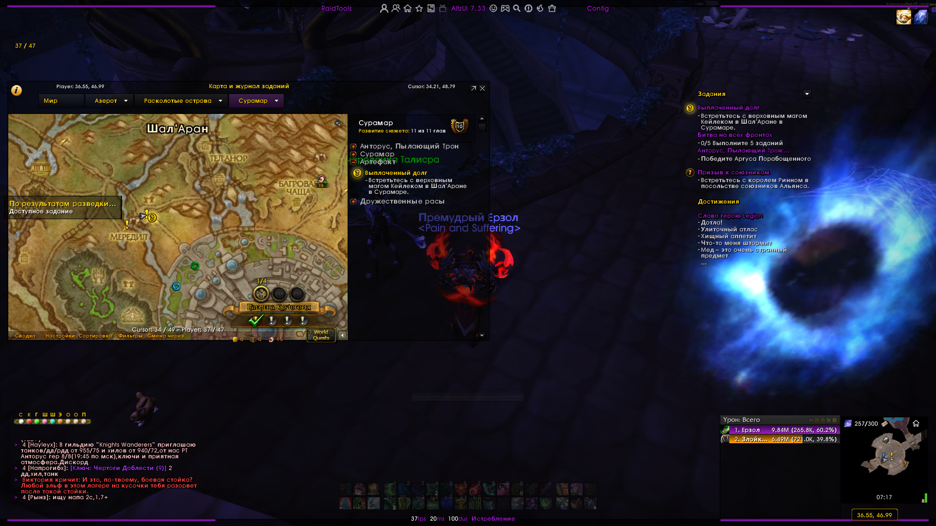 Еще раз честно скажу :) - первый комент относился к второй строке Вашего запроса, то есть ко второму проблемному квесту . По первому - с Окулетом - ситуация такая: Чтобы он появился в Шаларане его туда нужно принести :) То есть цепочка квестов , предваряющих проблемный должна быть выполнена. Пошарились в мастерской Окулета, тпшнулись ко входу в Шаларан. Сдали квест. Потом он говорит что все- дальше никак. И квест https://ru.wowhead.com/quest=40830 - взять его и занести в Шаларан к Талисре. Сдать ей квест. следующий - https://ru.wowhead.com/quest=44691 - откормить его маной, чтобы он мог торговать и вообще общаться. И только после этого он сможет дать нужный квест. На карте прикольный такой значок возле полетки у Вас показан. Это не к квесту 40830 он относится? Проверьте квесты этой цепочки, они все перечислены в коменте к https://ru.wowhead.com/quest=43523/%D0%B2%D1%8B%D0%BF%D0%BB%D0%B0%D1%87%D0%B5%D0%BD%D0%BD%D1%8B%D0%B9-%D0%B4%D0%BE%D0%BB%D0%B3#comments:id=2558433 . Возможно они недоделаны, поэтому Окулет еще не проявился в пещере. А вот если будет скрин , на котором видно что команды в чате .q s 40830 и .q s 44691 выдали ответы квест выполнен и квест сдан, а команда чата .q s 43523 пишет выполнен но не сдан - этот скрин будет основой для запроса в х1 на форуме для помощи от админов. Как то так. |