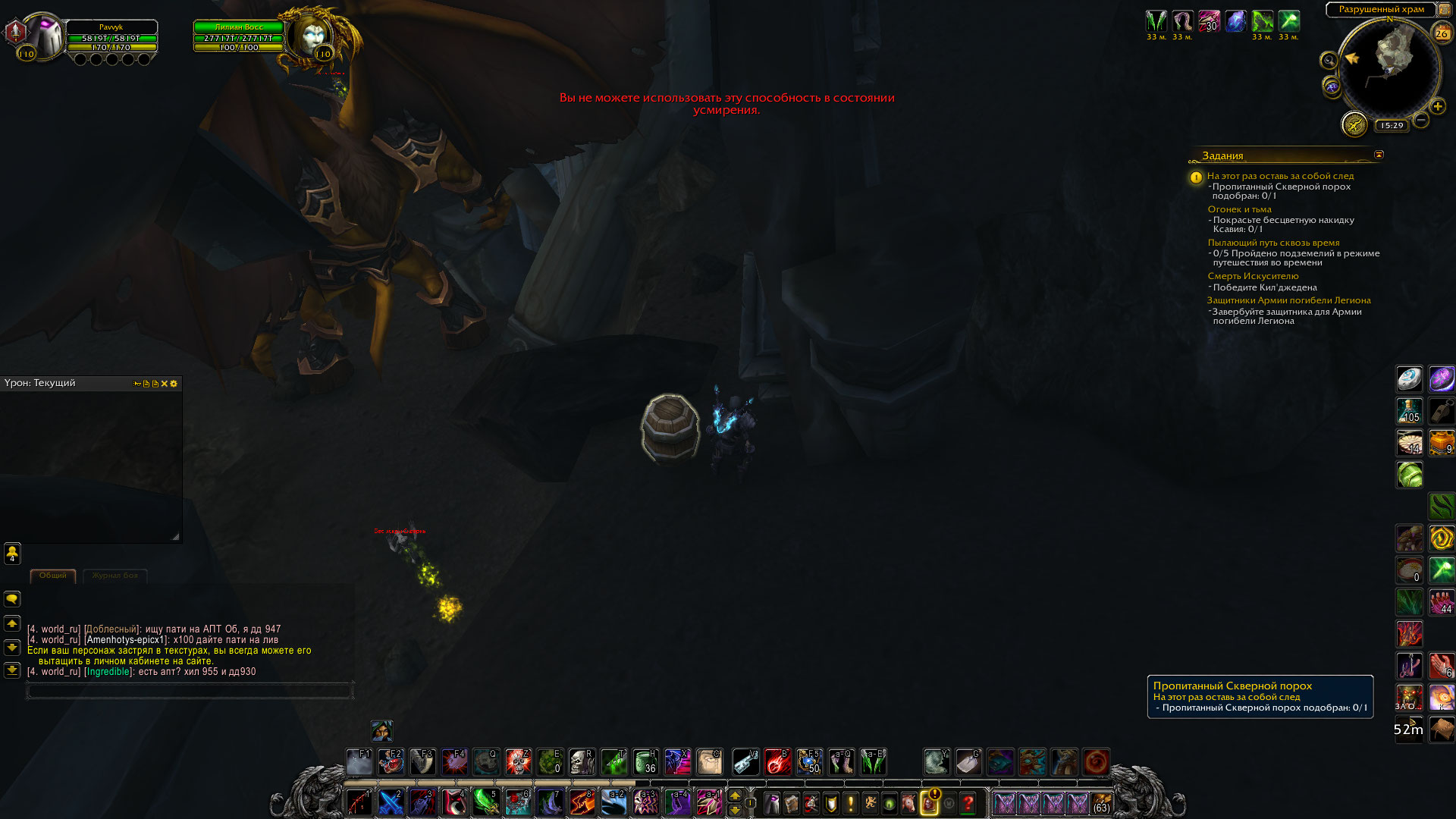 | Description | Не могу выполнить классовое задание https://ru.wowhead.com/quest=45629 . Когда пытаюсь подобрать пропитанный скверной порох, мне пишет, что вы не может использовать эту способность в состоянии усмерения. | ||||
