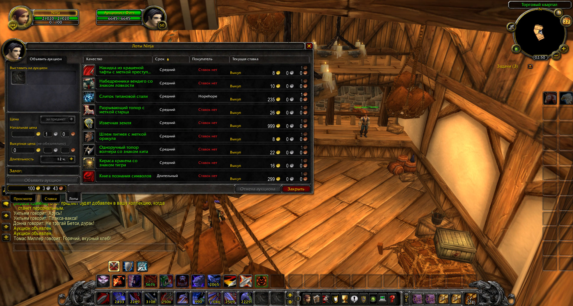 > Если выложить товар на аукцион с одинаковой длительностью, то они будут отображаться с разным сроком. Есть два срока, средний (от 2 до 12 часов) и длительный (> 12 часов) Проблема в том, что когда выкладываете предмет на срок в 12 часов, он сначала показывает "длительный", а потом "средний", как будто считает что 12 > 12 - True > И если посмотреть на скрине, то видно что товар куплен, но не отображается что он куплен и оплата за него в скором времени придёт. Игрок сделал ставку, а не выкупил предмет > А так же заметил и уже отписывал на форум о том, что по умолчанию цена товара выставляется не за связку, а за предмет. Хотя всё должно быть наоборот. Не удалось повторить > Когда игрок покупает товар, то приходит оповещение в чат и иконка почты (что что-то пришло). По сути там должно быть письмо где сказано: "На ваш товар нашёлся покупатель", но письмо приходит не всегда. А также иногда приходит пустое http://egammi.net/image/SeVr Не удалось повторить |