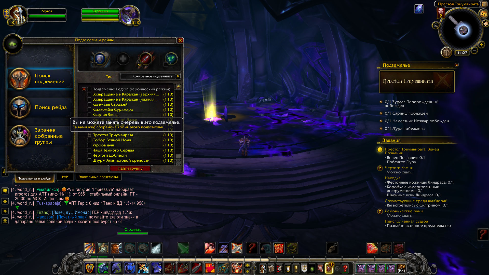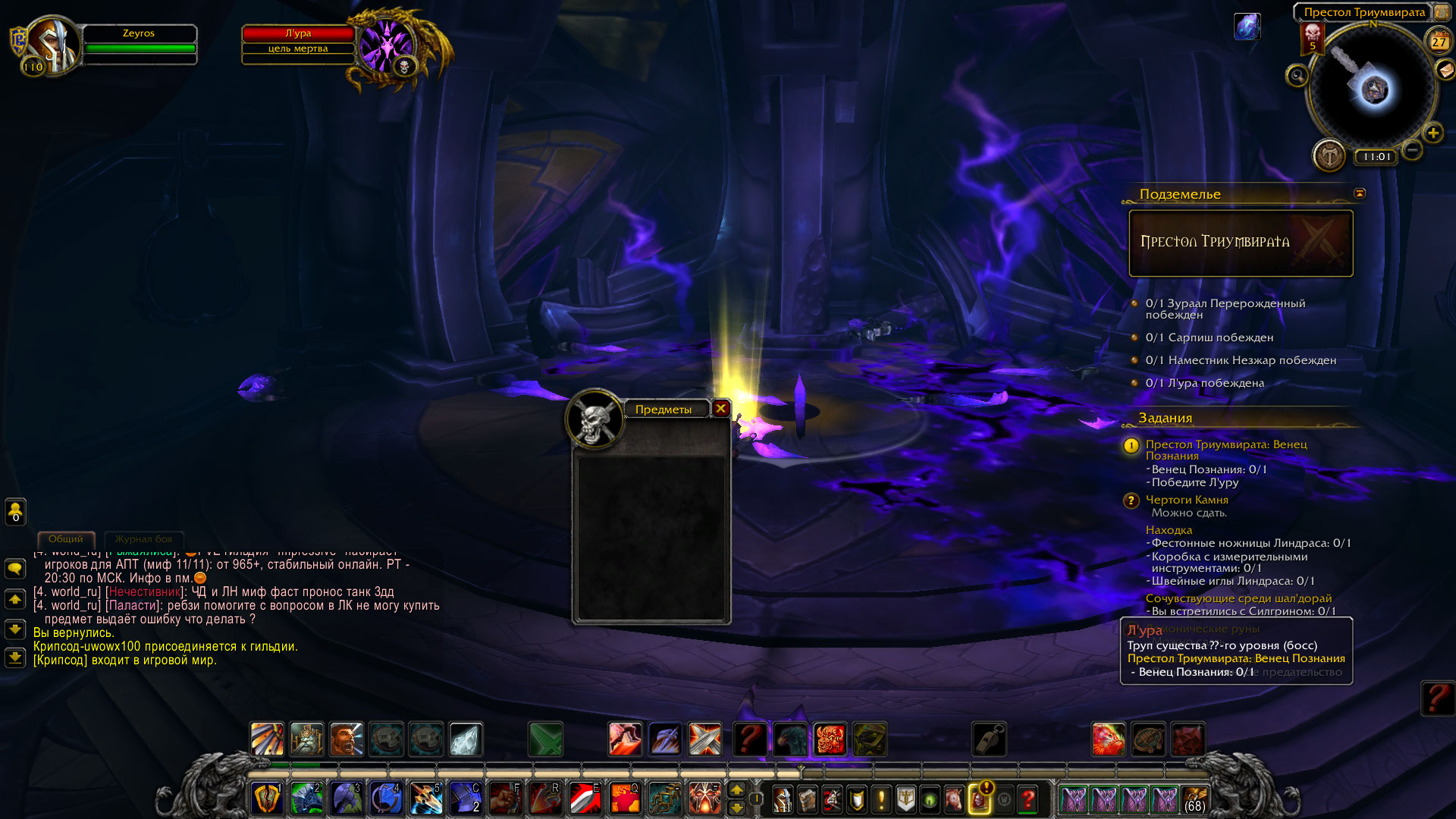 | Description | прохожу квест - Престол Триумвирата:венец познания.Что бы пройти этот квест,нужно пройти инст Престол триумвирата и убить Луру с которой падает этот венец. в итоге я его прошел, но с Луры венец не забирается. Открывается просто окошко пустое и все. Еще раз этот инст я пройти почему то не смогу потому что пишет что он у меня в резервной копии. прошу помогите как нибудь,потому что без этого квеста я не смогу пройти дальше цепочку квестов на Агусе. играю я на Uwow legion x100 . никнейм Zeyros. | ||||