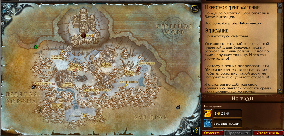 | Additional Information | От тестера: Отсуствует нпс https://ru.wowhead.com/npc=115307/алгалон-наблюдатель в https://ru.wowhead.com/the-storm-peaks Как выглядит у нас : http://immage.biz/image/Se3s Как должно выглядить : https://www.youtube.com/watch?v=K5jMc38-5Jg | ||||