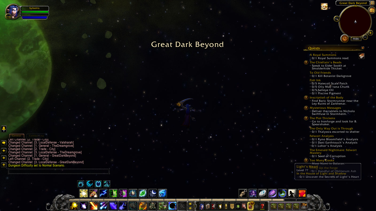 | Description | Attempting the quest https://www.wowhead.com/quest=44448/in-the-house-of-light-and-shadow yields the following result, at least as a Druid: Interacting with Light's Heart Using the Tears of Elune teleports the player to the Great Dark Beyond. This much is normal. However, instead of triggering a cutscene with https://www.wowhead.com/npc=113763/xera , you simply fall to your death and are unable to release spirit. The only way to get out of this situation appears to be by closing the game via the computer's operating system (as opposed to the "exit game" or "logout" buttons in the options menu which don't work in this situation). Once the game has been launched once again, you find yourself alive but in the Dun Morogh Workshop Entrance. I attempted this quest three times, each time yielding the exact same result. | ||||