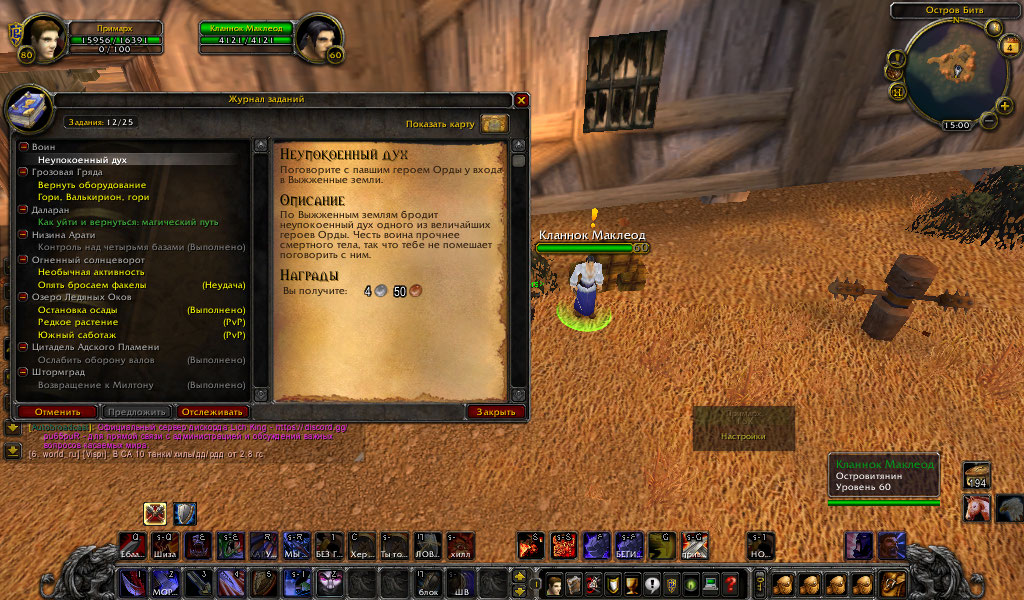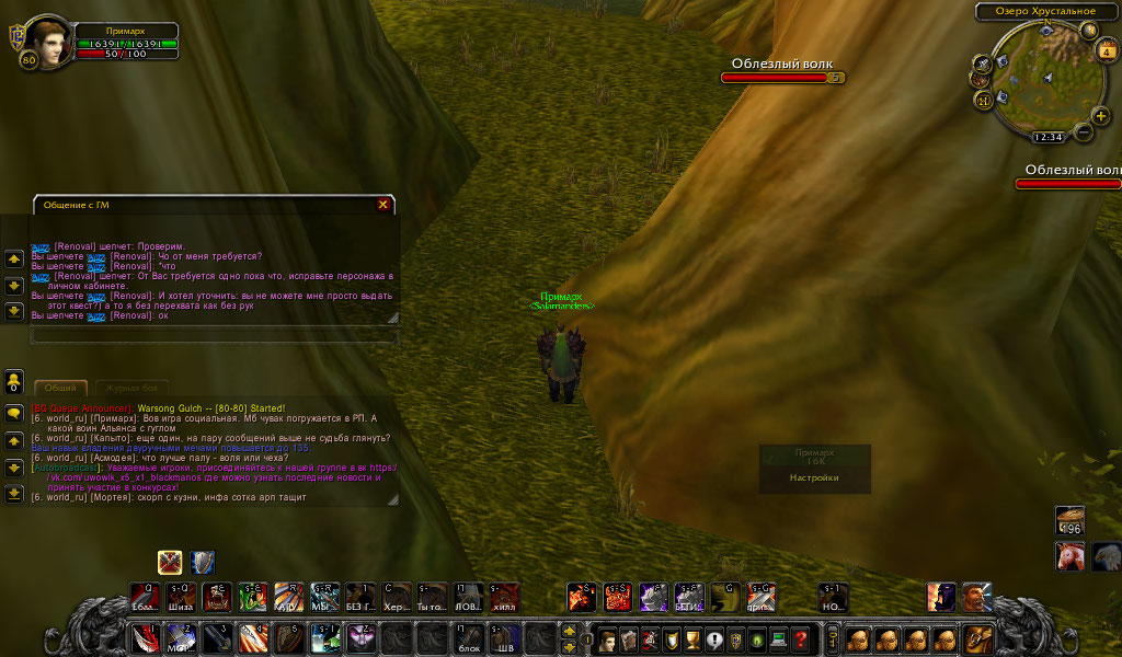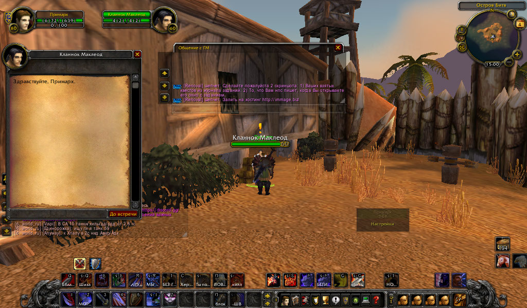 | Description | Здравствуйте. ДО 80-ГО ЛВЛ КАЧАЛСЯ БЕЗ СТОЙКИ БЕРСЕРКА. Теперь происходит следующее: иду в Штормград(старый город), беру квест из разряда "приди к тому-то и поговори с ним" и иду в степи, сдавать квест НПС "Кланнок Маклеод". Далее происходит следующее: я сдаю квест, над нпс появляется желтый восклицательный знак и все. Квеста нету, в диалоговом окне нету кв, а написано : "Здравствуй, ПРимарХ". Я трижды писал тиккет, со мной связывались 2 ГМ. Я прошу выдать мне эту гребаную стойку берсерка, ибо мне жалко времени , которое я потратил на прокачку перса и теперь не могу полноценно играть. Заранее благодарен. | ||||