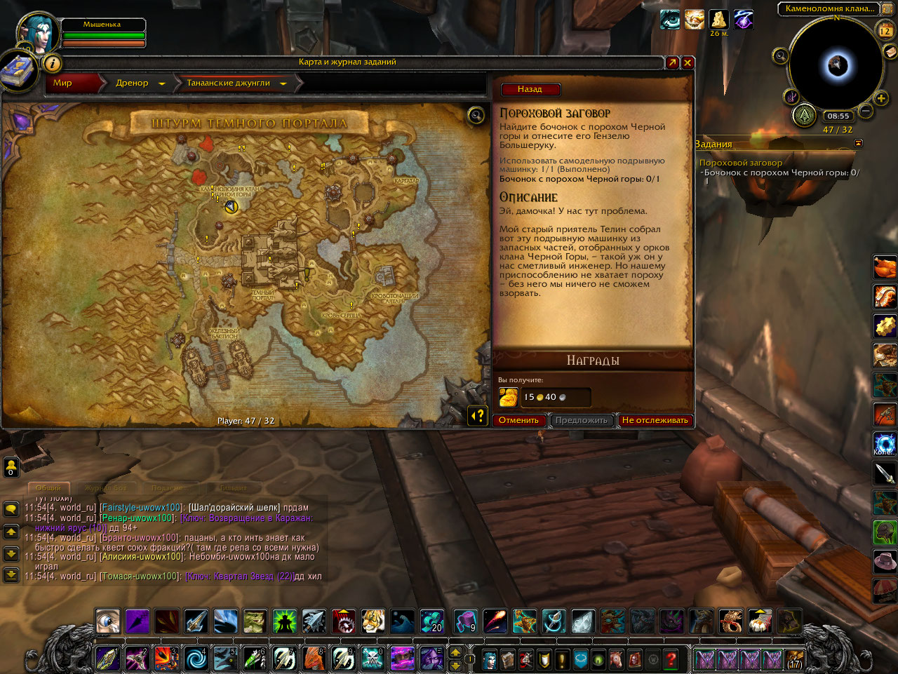 | Description | Цепочка заданий оборвалась на квесте "Пороховой заговор". Квест дает Гензель Большерук. Описание: Эй, <приятель/дамочка>! У нас тут проблема. Мой старый приятель Телин собрал вот эту подрывную машинку из запасных частей, отобранных у орков клана Черной Горы, – такой уж он у нас сметливый инженер. Но нашему приспособлению не хватает пороху – без него мы ничего не сможем взорвать. Там где должен быть Бочонок с порохом Черной горы его нет. Несколько раз отменяла и проходила заново, не помогает. | ||||