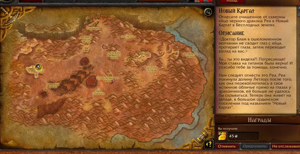 | Description | Нету НПС которому надо сдать квест https://ru.wowhead.com/quest=27889/новый-каргат . | ||||