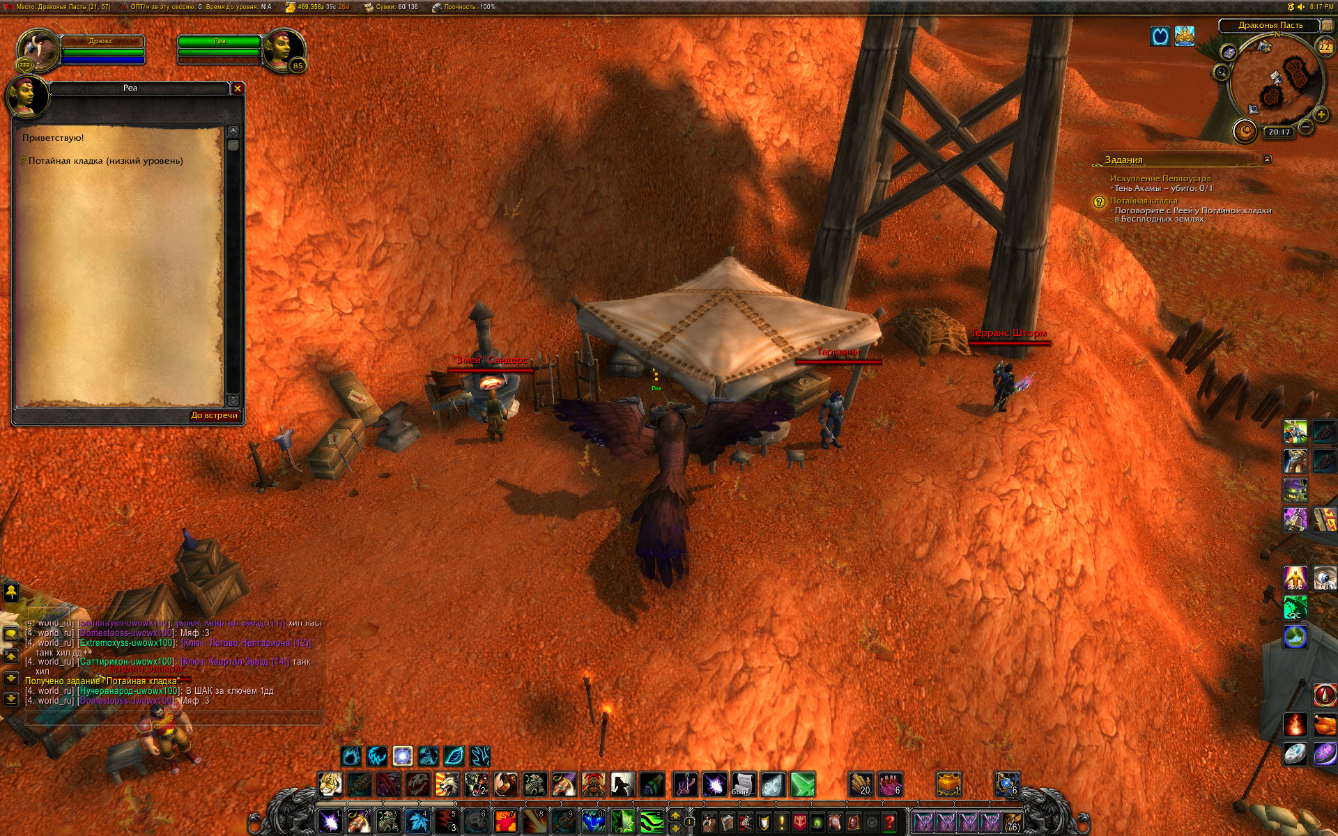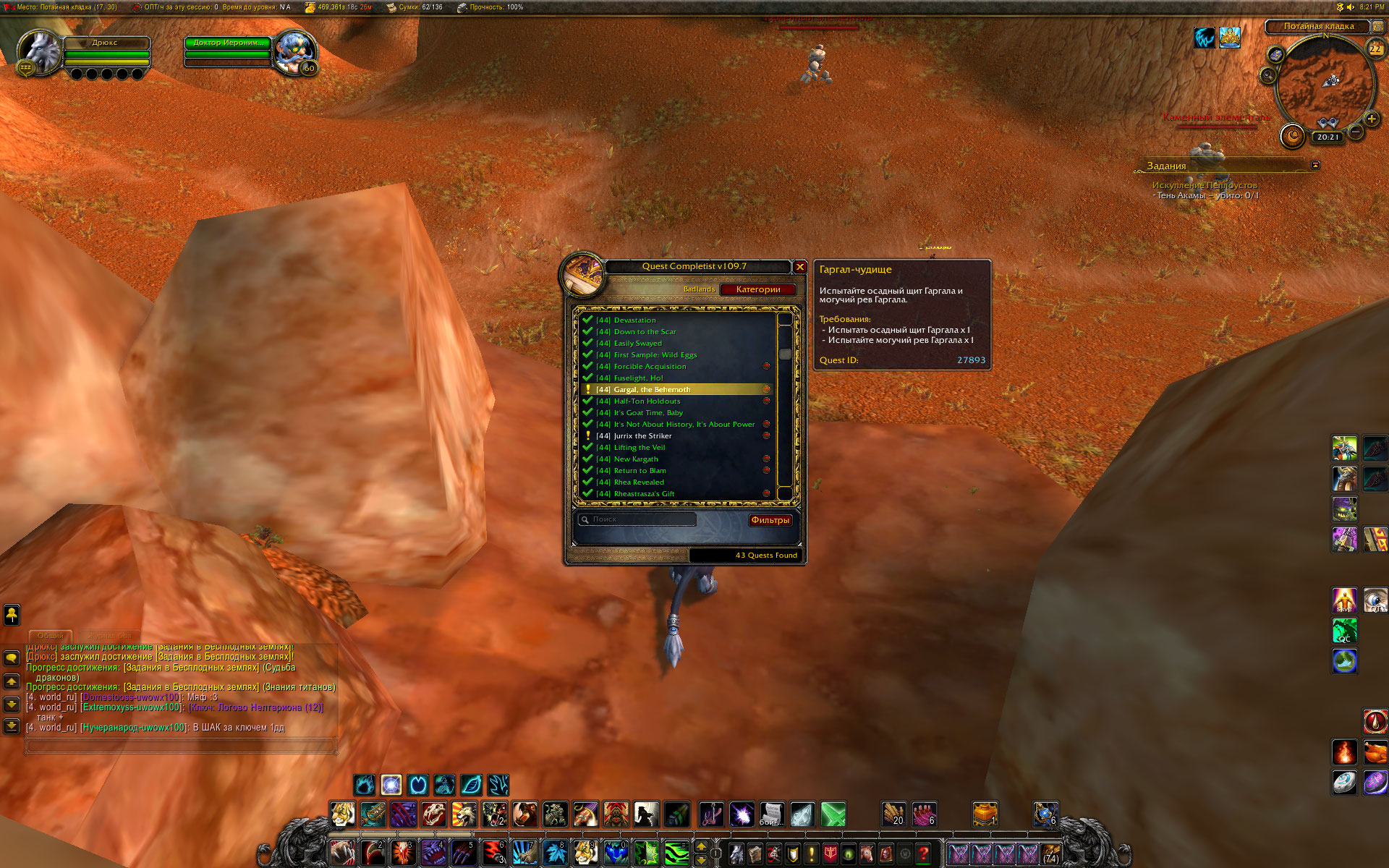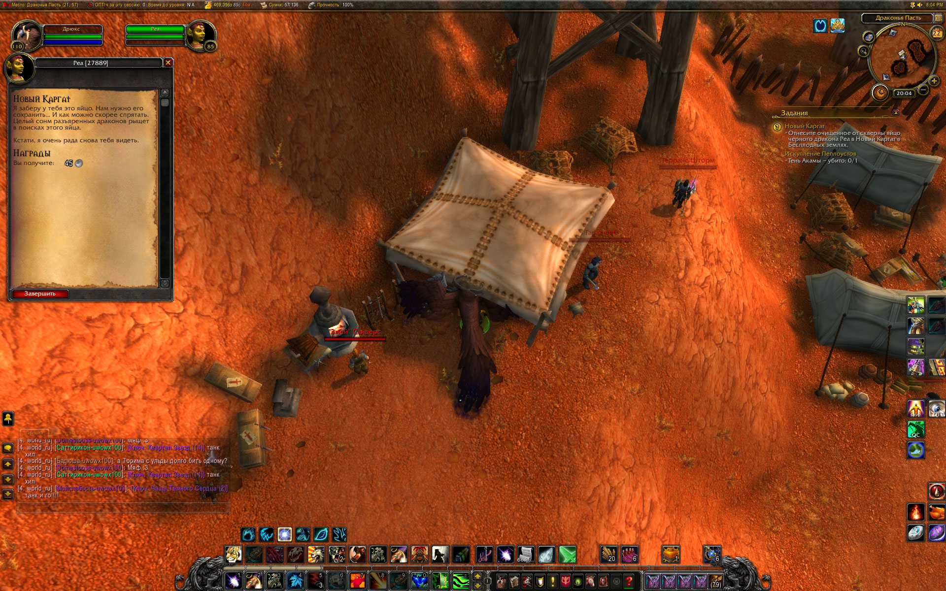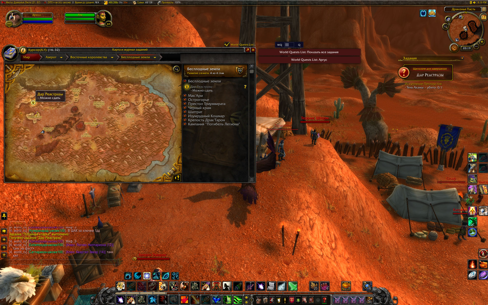 Вы уж меня простите, Mirage24 , но небольшой разбор полетов я просто обязан провести. Первое - скриншот из http://tracker.legionbugs.com/view.php?id=11716#c34100 - Реа на том месте по сюжету превращается в Реастразу, что видно на одном из моих скриншотов. Далее. Квест Новый Каргат согласно вовхед должен выдаваться нпс в северо-западной части локации, у нас квест выдается нпс сразу после предыдущего квеста и там, где это показано на скриншоте. Скорее всего на вовхеде смесь из старых, доКатовских квестов и новых. В тултипе квеста указано, что встретиться с Реа нужно в Новом Каргате. С этим Вы согласились. Очень хорошо. Но дело в том , что Ваш совет выдвигаться к Реа в лагерь Альянса персонажем Орды .... мягко говоря не совсем корректен. В двух шагах от Реа там стоит смотритель полетки 100 уровня и несколько нпс 45-46 уровня. То есть на актуальном 40-50 уровне забегать в лагерь противоположной фракции совершенно неразумное действие. Далее. По непонятной причине на нескольких квестах цепочки активирован режим автоматической сдачи квеста "на месте", кнопка завершить квест появляется, но чтобы взять следующий квест у Реа, требуется снова и снова возвращаться в лагерь противоположной фракции. Далее. Квест, последующий за квестом Новый Каргат, а именно https://ru.wowhead.com/quest=27890 , открывает доступ к трем квестам у НПС в таверне к следующему по списку квесту https://ru.wowhead.com/quest=27891 и к еще двум квестам https://ru.wowhead.com/quest=27892 и https://ru.wowhead.com/quest=27893 . Но одна проблема в том, что по любому из квестов персонажу выдается спутник-питомец, с помощью скиллов которого надо выполнить критерии квеста. И все три квеста можно взять, но сопровождать персонажа может только один питомец. Если квесты отменить, то повторно они уже не выдаются, если их не взять до того, как будет сдан первый из тройки квестов - квесты пропадают у НПС-квестодателей. К счастью, сделаны два оставшихся квеста или нет - это не влияет на получение достижения хм в локации. Квесты https://ru.wowhead.com/quest=27897 и https://ru.wowhead.com/quest=27898 также отсылают в зону Потайная кладка, но естественно, Реи там нет. Поэтому приходится или сдавать квесты автоматом и возвращаться в лагерь Альянса или сдавать их Рее на месте сразу после получения. И вишенка на торте - финальный квест дает удвоенную награду в виде двух уникальных тринкетов, одеть можно только один, второй на продажу. |