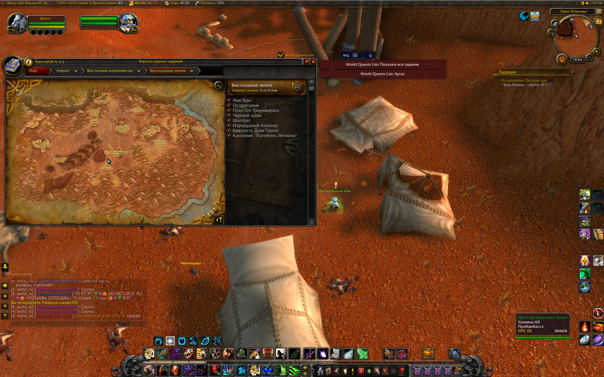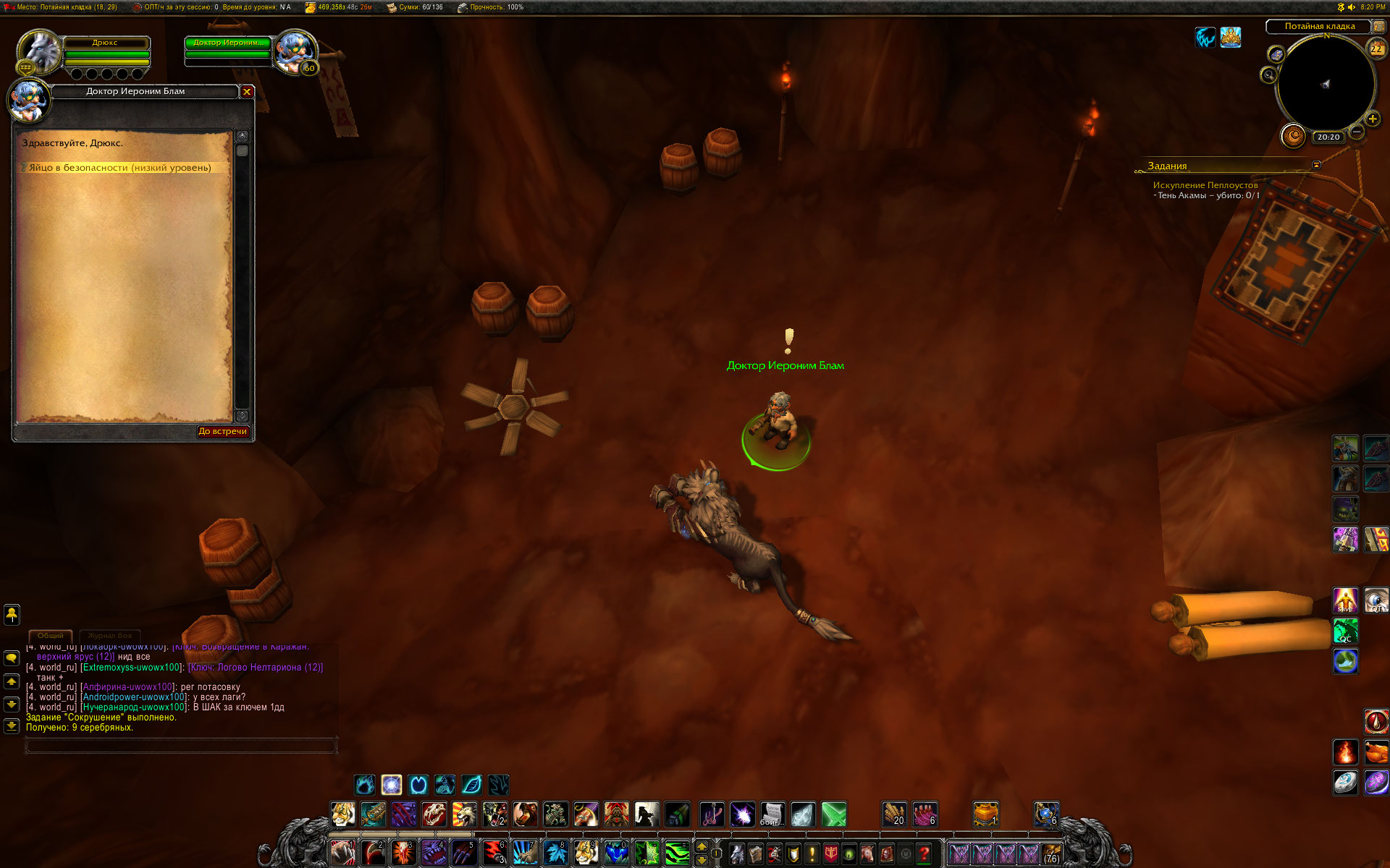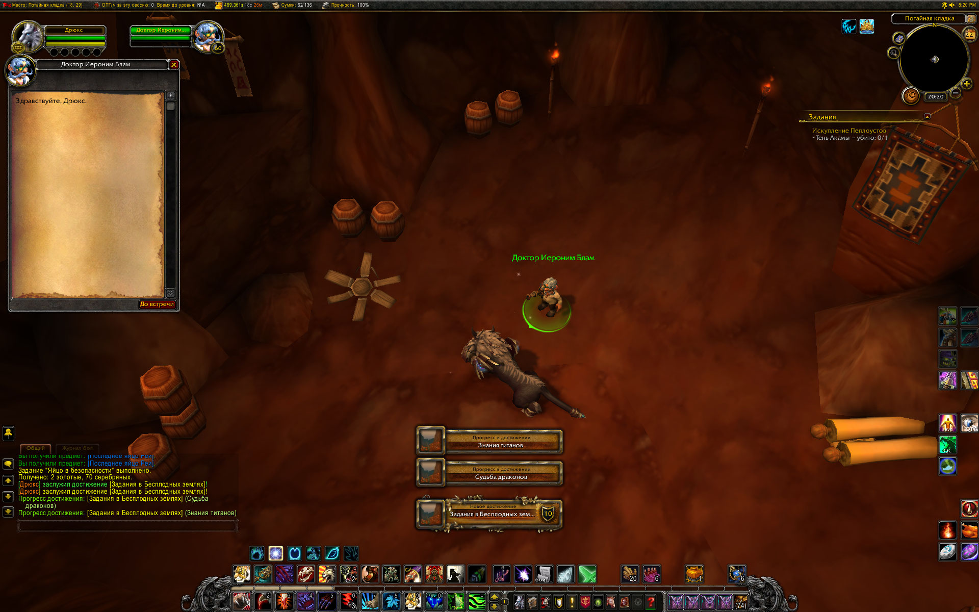 Вы уж меня простите, Mirage24 , но небольшой разбор полетов я просто обязан провести. Первое - скриншот из http://tracker.legionbugs.com/view.php?id=11716#c34100 - Реа на том месте по сюжету превращается в Реастразу, что видно на одном из моих скриншотов. Далее. Квест Новый Каргат согласно вовхед должен выдаваться нпс в северо-западной части локации, у нас квест выдается нпс сразу после предыдущего квеста и там, где это показано на скриншоте. Скорее всего на вовхеде смесь из старых, доКатовских квестов и новых. В тултипе квеста указано, что встретиться с Реа нужно в Новом Каргате. С этим Вы согласились. Очень хорошо. Но дело в том , что Ваш совет выдвигаться к Реа в лагерь Альянса персонажем Орды .... мягко говоря не совсем корректен. В двух шагах от Реа там стоит смотритель полетки 100 уровня и несколько нпс 45-46 уровня. То есть на актуальном 40-50 уровне забегать в лагерь противоположной фракции совершенно неразумное действие. Далее. По непонятной причине на нескольких квестах цепочки активирован режим автоматической сдачи квеста "на месте", кнопка завершить квест появляется, но чтобы взять следующий квест у Реа, требуется снова и снова возвращаться в лагерь противоположной фракции. Далее. Квест, последующий за квестом Новый Каргат, а именно https://ru.wowhead.com/quest=27890 , открывает доступ к трем квестам у НПС в таверне к следующему по списку квесту https://ru.wowhead.com/quest=27891 и к еще двум квестам https://ru.wowhead.com/quest=27892 и https://ru.wowhead.com/quest=27893 . Но одна проблема в том, что по любому из квестов персонажу выдается спутник-питомец, с помощью скиллов которого надо выполнить критерии квеста. И все три квеста можно взять, но сопровождать персонажа может только один питомец. Если квесты отменить, то повторно они уже не выдаются, если их не взять до того, как будет сдан первый из тройки квестов - квесты пропадают у НПС-квестодателей. К счастью, сделаны два оставшихся квеста или нет - это не влияет на получение достижения хм в локации. Квесты https://ru.wowhead.com/quest=27897 и https://ru.wowhead.com/quest=27898 также отсылают в зону Потайная кладка, но естественно, Реи там нет. Поэтому приходится или сдавать квесты автоматом и возвращаться в лагерь Альянса или сдавать их Рее на месте сразу после получения. И вишенка на торте - финальный квест дает удвоенную награду в виде двух уникальных тринкетов, одеть можно только один, второй на продажу. |