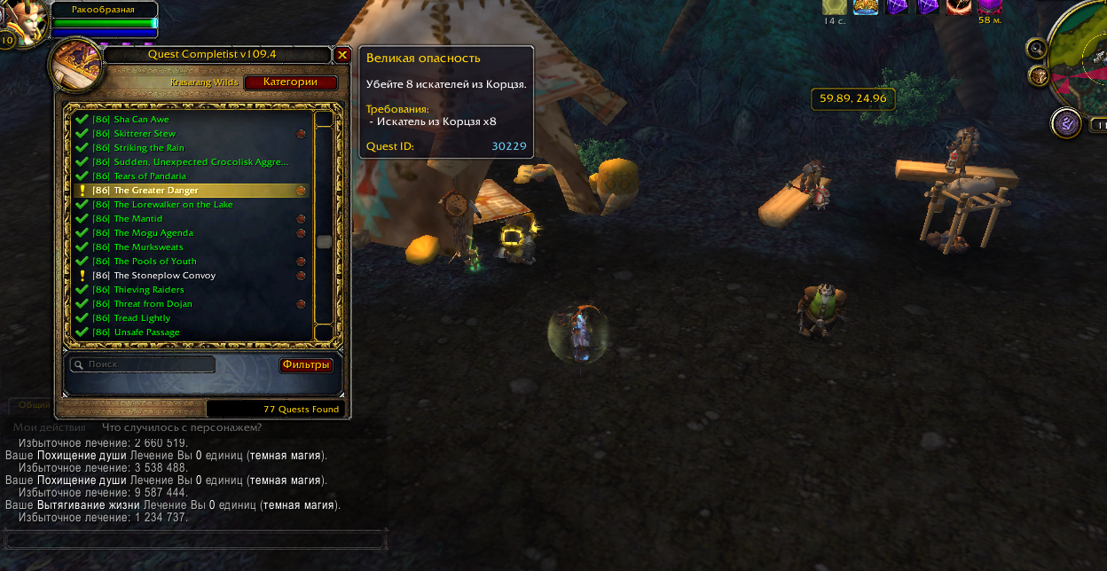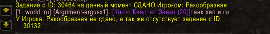 Проверка на обгон для чего - во многих локациях квесты выдаются не последовательно, а как получится. И бывает, что квест с конца выполнен сдан - а квест который должен быть до него просто исчезает, иногда вместе с квестодателем. Пример - Северные степи, Лагерь Котельника. Там если тупо прийти в лагерь и взять квесты какие дадут , их можно все выполнить и сдать. но несколько квестов сюжетки после этого не выдадут и достижение не получить. Проделать такую проверку, исключить вариант - быстрее и проще решится проблема. тем более что раньше можно было просто прогуливаясь по Красарангу получить и выполнить квест на спасение неписей из Каменного плуга. Кажется этот https://ru.wowhead.com/quest=30230 . Большинство моих чаров так или иначе качались в Пандарии и везде планка в виде квестов которые должны быть , но их нет и без помощи ГМов не получить. А запороть и пару чаров, которые в Пандарии не были - как два пальца, если не принять меры предосторожности. Так что я тоже лицо заинтересованное. |