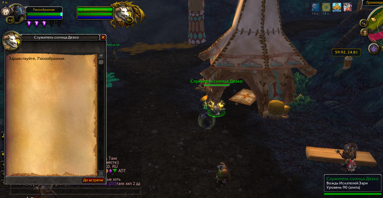 Посмотрел я инфу на вовхеде. Крайне неубедительно выглядит положение этого НПС на картах вовхеда. Первое - две точки респа - в Громовой расселине и в укрытии Искателей зари. Но все точки начала квестов сводятся к первому местоположению. Второе - развитие сюжета предполагает , что два квеста должны выдаваться в Громовой расселине (зоны квестов рядом, затем пак квестов по сюжету с плавным перемещением к укрытию Искателей зари и выдачей второй пары квестов в укрытии. Третье - видео с вовхеда однозначно указывает, что квест https://ru.wowhead.com/quest=30229 должен выдаваться на второй точке, рядом с зоной выполнения. Мнение - тестеру надо проверить корректность последовательности выдаваемых квестов и возможно, подкорректировать положение НПС на разных этапах сюжета. Игроку - проверить состояние последующих квестов этой цепочки, начиная с https://ru.wowhead.com/quest=30230 .q s 30230 .q s 30164 .q s 30174 .q s 30141 может какой то квест по дороге самовыполнился и обрубил возможность получения нужного квеста. |