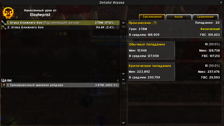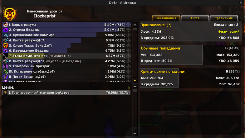 https://www.warcraftlogs.com/reports/8fPkcYCyvWb1DamL#fight=last&source=1&type=damage-done лог с нашего сервера 00:01:05.192 Подчиняющий разум (Etozheprist) Melee Скованный демон Бездны 129307 предпоследний хит от бендера 00:01:06.022 Подчиняющий разум (Etozheprist) Melee Скованный демон Бездны 129307 последний хит от него промежуток составил 0,83 секунды на момент на мне было 58 стаков войды 00:01:05.389 Etozheprist gains Облик Бездны (58) from Etozheprist это при 17к базовой хасты (для не понимающих тест был в 3 таргета чтобы как можно дольше просидеть в войд форме) https://www.warcraftlogs.com/reports/8VGwgZMTNQytjhLb#fight=34&type=damage-done&source=53 лог приста на вариматрасе (без покорения безумию) у него было 15,487 хасты, и трейт в артефакте на длительность бендера https://www.wowhead.com/spell=238065/fiending-dark?rank=3 был взят 4/4 раз т.е. у него не было реликов на него. 00:01:02.923 Mindbender 1 (Empører) Melee Varimathras 252279 предпоследний хит от бендера 00:01:03.633 Mindbender 1 (Empører) Melee Varimathras *504557* последний хит от него промежуток 0,71 на нем 54 стака войды 00:01:02.216 Empører gains Voidform (54) from Empører бл к тому моменту уже спал 00:00:50.829 Nikoru's Bloodlust fades from Empører как мы видим разница ощутима, учитывая что у меня на момент теста было на 2к больше базовой хасты(см. прикреп) и на 4 стака войды было больше, еще как видно что урон от хитов бендера очень сильно урезан, стоит и задеть тему его передвижения, когда босса кайтят/отводят, он вообще не бьет а медленно бежит за ним, хотя если посмотреть видео с ютуба, то там можно разглядеть что в передвижении бендер должен бить тем самым генерируя присту ресурсы. |