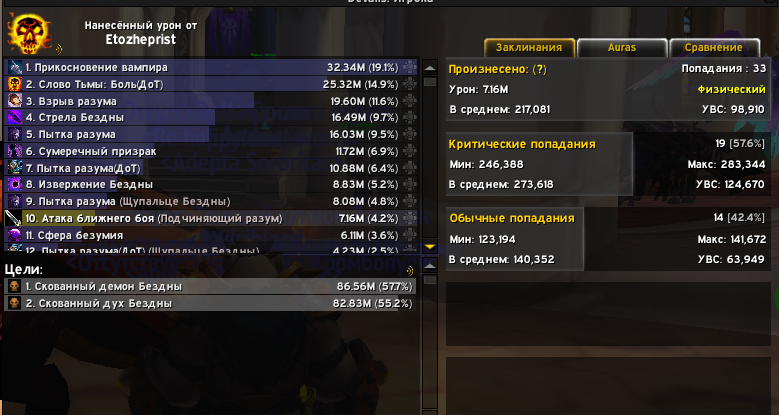 В идеальных условиях (бой с манекеном) теперь количество ударов идентично количеству ударов, которое было бы на офе. На скрине сегмента, где много попаданий, пет призывался 5 раз (имеем 34 попадания за призыв в среднем). Ротацию держать стало значительно приятнее. Спасибо! Где же Вы были раньше? |