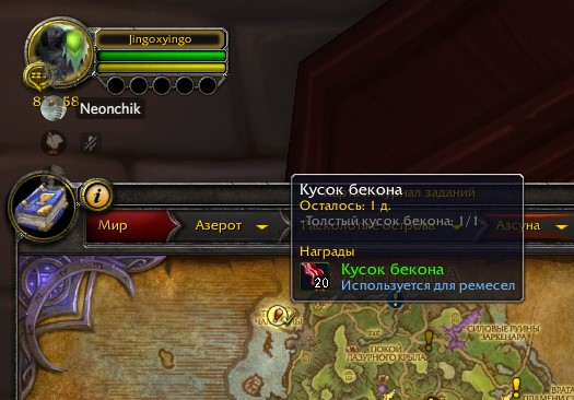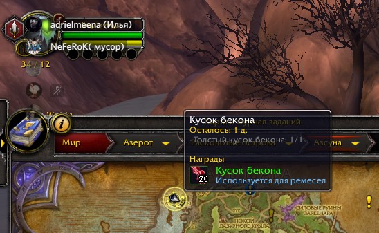 А выбросить из сумок квестовый предмет Толстый кусок бекона? Его наличие в сумке является триггером для закрытия локалки. И по идее он должен пропадать из сумки сразу после получения и заменяться на обычный бекон. Забагать можно только одним способом - убить квестового жирного неважно кого, когда оно стоит на точке локалки , но самой локалки нет. Квестовый предмет упадет в сумку. А в Вальшаре квестовый моб стоит в двух местах, где локалка никогда не появлялась. И освободить место в рюкзаке (первой сумке) для срабатывания квеста. |