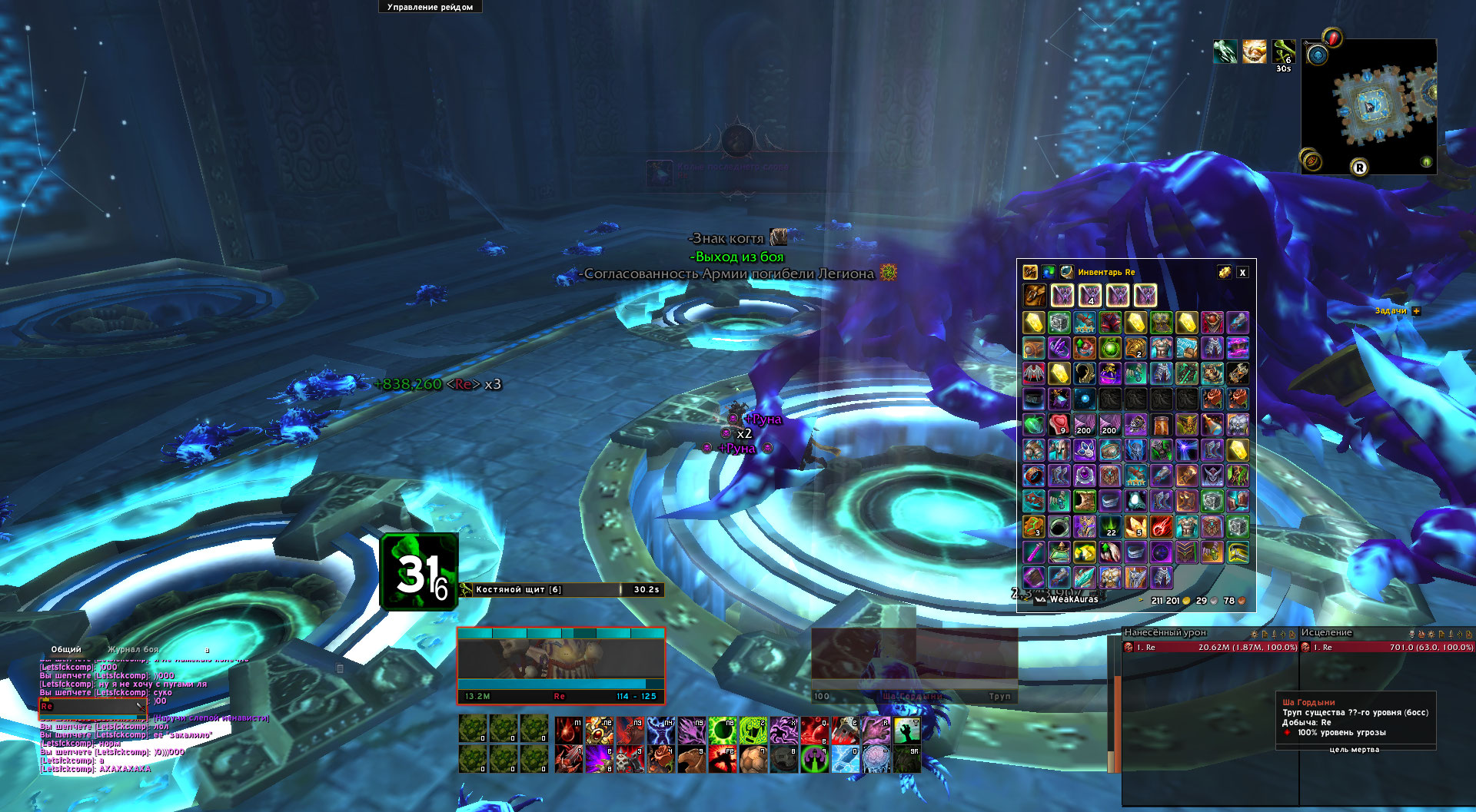 | Description | 1. Если зарегать Гарроша то к нему нельзя попасть ткк нельзя запустить клакси ибо не закрыты пред. кварталы. 2. С Глубиния по Ша Гордыни (точнее в самом ша лежала 1 шмотка чего быть не должно вообще, там должен появляться сундук) нет лута. (Лут есть только в Норусхен) У ША сундук не выходит из фазы. До Норусхена - лута вообще нет 2.1 Возможно в остальных боссах тоже нет, не удалось проверить ткк забагался Галакрас. 3. Галакрас если умереть во время боя то невозможно встать с тела. Бой не прекращается. 4. Не наступает фаза на Пандарийских трофеях, когда зачистили две комнаты | ||||