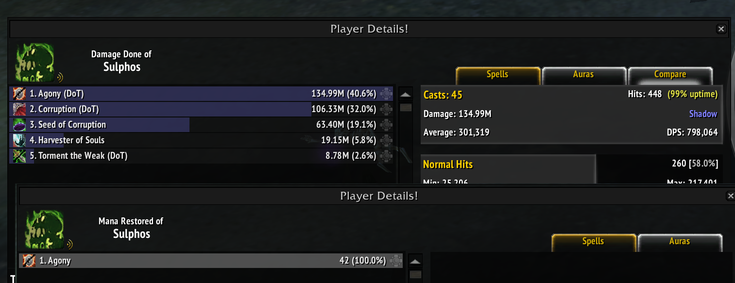 Looking at up to 7 targets now. Argusx100 logs, Antorus Argus, Add phase. https://www.warcraftlogs.com/reports/91VvArk3dQMNZXch/#type=damage-done&fight=last&source=1&start=6835580&end=6935855 (261 P) https://www.warcraftlogs.com/reports/91VvArk3dQMNZXch/#type=resources&fight=last&source=1&start=6835580&end=6935855&spell=107 (19 O) 7.3% https://www.warcraftlogs.com/reports/qraMLpQvNd3FPycA/#type=damage-done&fight=last&source=2&start=8925270&end=9062644 (356 P) https://www.warcraftlogs.com/reports/qraMLpQvNd3FPycA/#type=resources&fight=last&source=2&start=8925270&end=9062644&spell=107 (31 O) 8.7% https://www.warcraftlogs.com/reports/PnF41wHYNWcX9aJG/#type=damage-done&fight=last&start=6802843&end=6927931&source=3 (346 P) https://www.warcraftlogs.com/reports/PnF41wHYNWcX9aJG/#type=resources&fight=last&start=6802843&end=6927931&source=3&spell=107 (30 O) 8.7% Official retail logs, Antorus Argus, Add phase https://www.warcraftlogs.com/reports/tzJVjYxAMvWkByRb#fight=38&type=damage-done&start=664915437&end=665055082&source=417 (402 P) https://www.warcraftlogs.com/reports/tzJVjYxAMvWkByRb#fight=38&type=resources&start=664915437&end=665055082&source=417&spell=107 (30 O) 7.5% https://www.warcraftlogs.com/reports/kKLHtDMyNQ49g6w2#fight=3&type=damage-done&source=6&start=6475702&end=6615731 (380 P) https://www.warcraftlogs.com/reports/kKLHtDMyNQ49g6w2#fight=3&type=resources&source=6&start=6475702&end=6615731&spell=107 (28 O) 7.4% https://www.warcraftlogs.com/reports/B7wazLNbmMKQqnFk#fight=2&type=damage-done&source=33&start=6198234&end=6362533 (406 P) https://www.warcraftlogs.com/reports/B7wazLNbmMKQqnFk#fight=2&type=resources&source=33&start=6198234&end=6362533&spell=107 (30 O) 7.4% Keep in mind this is harder to compare than 3 targets or 2 targets because adds don't live the same amount of time. But still, all looks fine, no agony shard generation bugs. But you just cannot compare a whole m+ dungeon because the result depends on how long the bosses live, how many adds you pull etc. |