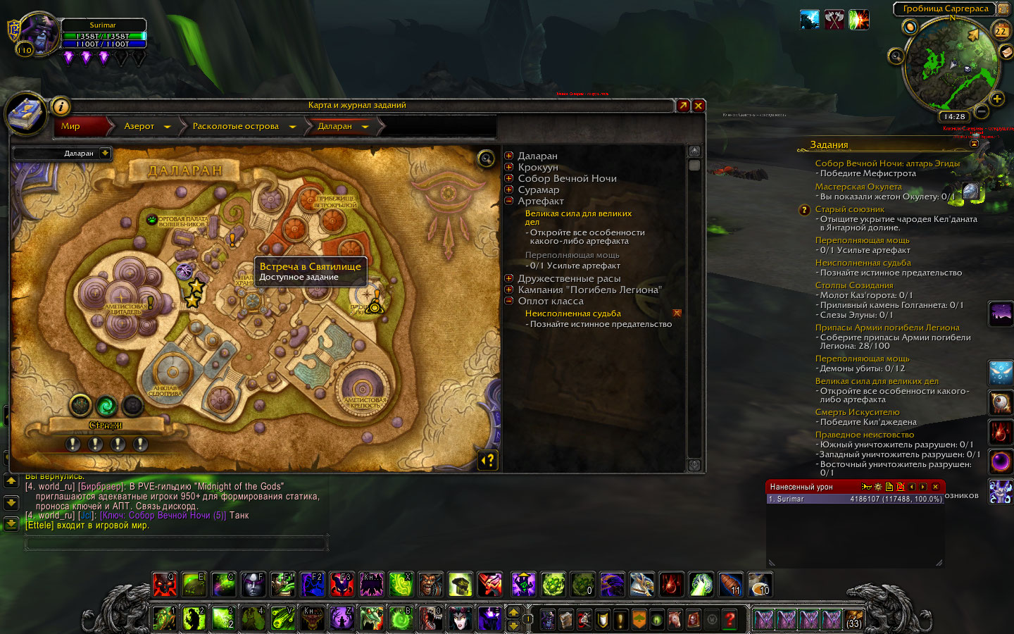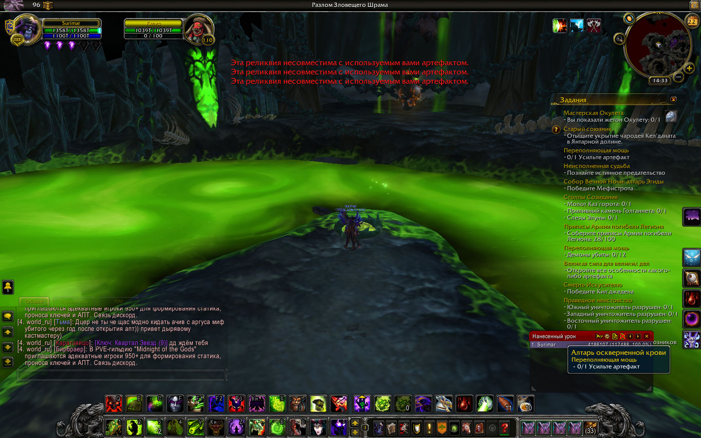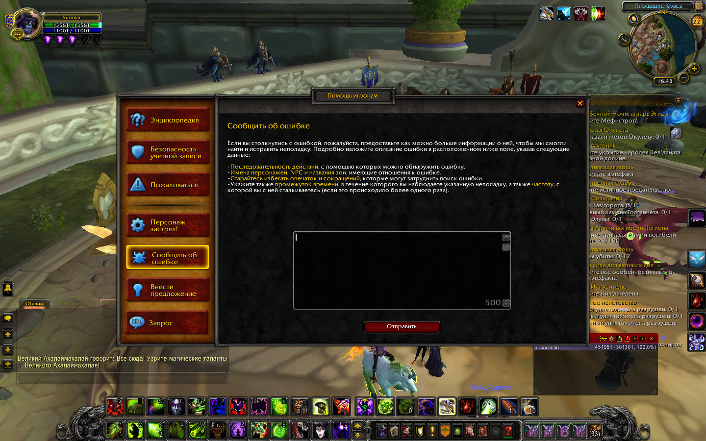 | Description | Дойдя до квеста https://ru.wowhead.com/quest=43254/%D1%81%D0%BE%D1%80%D0%B2%D0%B0%D1%82%D1%8C-%D1%80%D0%B8%D1%82%D1%83%D0%B0%D0%BB ,( сорвать ритуал ) а именно Поговорить с Гулданом, по цепочке на артефакт ветки "Разрушение" https://ru.wowhead.com/item=128941/%D1%81%D0%BA%D0%B8%D0%BF%D0%B5%D1%82%D1%80-%D1%81%D0%B0%D1%80%D0%B3%D0%B5%D1%80%D0%B0%D1%81%D0%B0?bonus=0 ,(Скипетр Саргераса) , подойдя к Гулдану и нажимая на диалог с ним ничего не происходило . Я написал на форум проекта Uwow(legion x100) , в раздел по решинию данной проблемы , они закрыли мне этот квест , но дальнейшей цепочки не было , и получить артефакт я соответсвенно не могу . Проверил все точки выполнения квеста, нигде его повторно взять не могу , артфакта в инвентаре и других местах тоже нет. Следующие артефакты и квесты на них так же не доступны. Прошу помочь в решении данной проблемы , выдачей артефакта, починкой квеста (откатом) , либо любым другим способом . Спасибо за понимание. Первый раз пишу багрепорт , без понятия когда и как ждать от вас обратную связь-починку данной проблемы.( так же не знаю нужно ли прилагать скрины , надеюсь нет ) С уважением игрок проэкта))) | ||||
