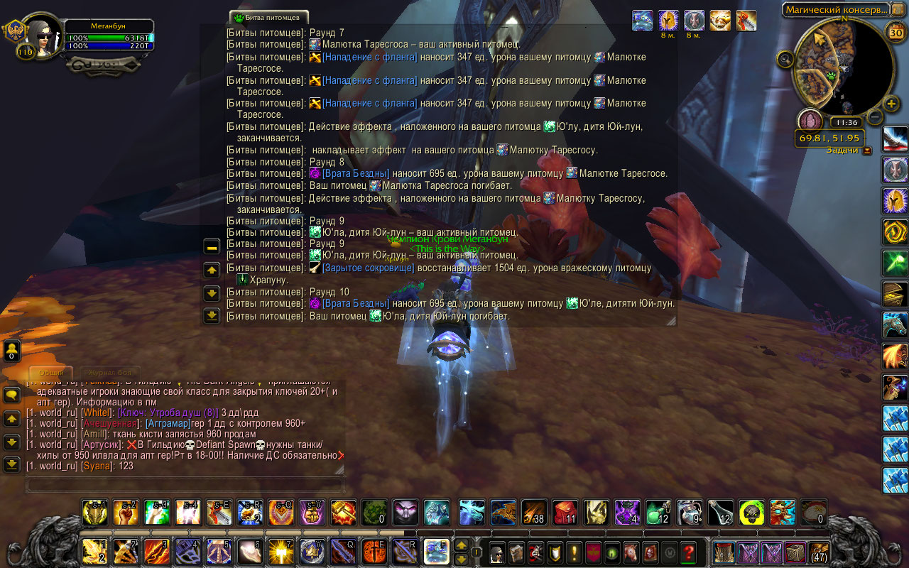 Здравствуйте! Вот общий репорт, сюда заношу баги, связанный с баттлпетами: http://tracker.legionbugs.com/view.php?id=9405 По порядку: https://ru.wowhead.com/npc=128016 > https://ru.wowhead.com/pet-ability=764 должна перезаряжаться 4 хода. У нас же 2. Так же действует один раунд. У нас же 2. Можно скрин проблемы? У меня эта ящерка ушла в уклон на 1 ход, заюзала снова через 4 хода, иногда даже уклон сразу спадал http://egammi.net/image/SfvO > https://ru.wowhead.com/pet-ability=429 должна наносить 328ед. урона. У нас же 800+ Почему 328? В самой игре написано 551-827 http://egammi.net/image/SfvG > Так же питомец игнорирует ходы. И проводит 3/4 атаки с применением способностей. То есть убивает три пета подряд, не давая возможность сделать ход. Не получилось повторить, прыгуана всегда била меня по 1 разу, два раза только когда убивала питомца https://ru.wowhead.com/npc=128014 > https://ru.wowhead.com/pet-ability=578 должна восстанавливать 25% здоровья. У нас же исцеляет полностью. Перезарядка должна быть 3 хода, у нас 2. Про это есть в общем репорте: "4. Способности, исцеляющие петов в процентах - всегда полностью исцеляют" > https://ru.wowhead.com/pet-ability=193 должна провести 1-2 атаки с уроном 124ед. У нас же проводит 3-4 атаки с уроном в 350+ У меня проводила 1-3 атаки, 4 ни разу не было, по 347 урона http://egammi.net/image/SfvE http://egammi.net/image/Sfvw |