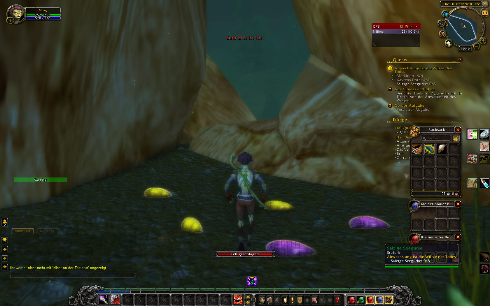 | Steps To Reproduce | Ich nehme die Quest "Abwechslung ist die Würze des Todes" (#24976) an und begebe mich zu der Brandung an der Flüsternden Küste. Dort tauche ich ins Wasser, wo mir die "Salzige Seegurke", durch die leuchtende Umrandung, als Ziel angezeigt wird. Wenn ich nahe genug dran bin, dann klicke ich die rechte Maustaste. Es erscheint der Ladebalken "Seegurke sammeln". Sobald der Ladebalken vollständig geladen ist ändert sich dieser auf "Fehlgeschlagen" und die Nachricht "Euer Ziel ist tot" erscheint auf dem Bildschirm. Die "Salzige Seegurke" verschwindet daraufhin. Ich habe jedoch kein Item in meiner Tasche und auch im Questlog wurde sie nicht hinzugezählt. Ich habe es bei mehreren Seegurken ausprobiert. Oder auch mal die linke Maustaste gedrückt. Ich habe die Quest abgebrochen und erneut gestartet und auch das komplette Spiel beendet und neu gestartet. Leider kann ich das Item immer noch nicht aufnehmen. | ||||