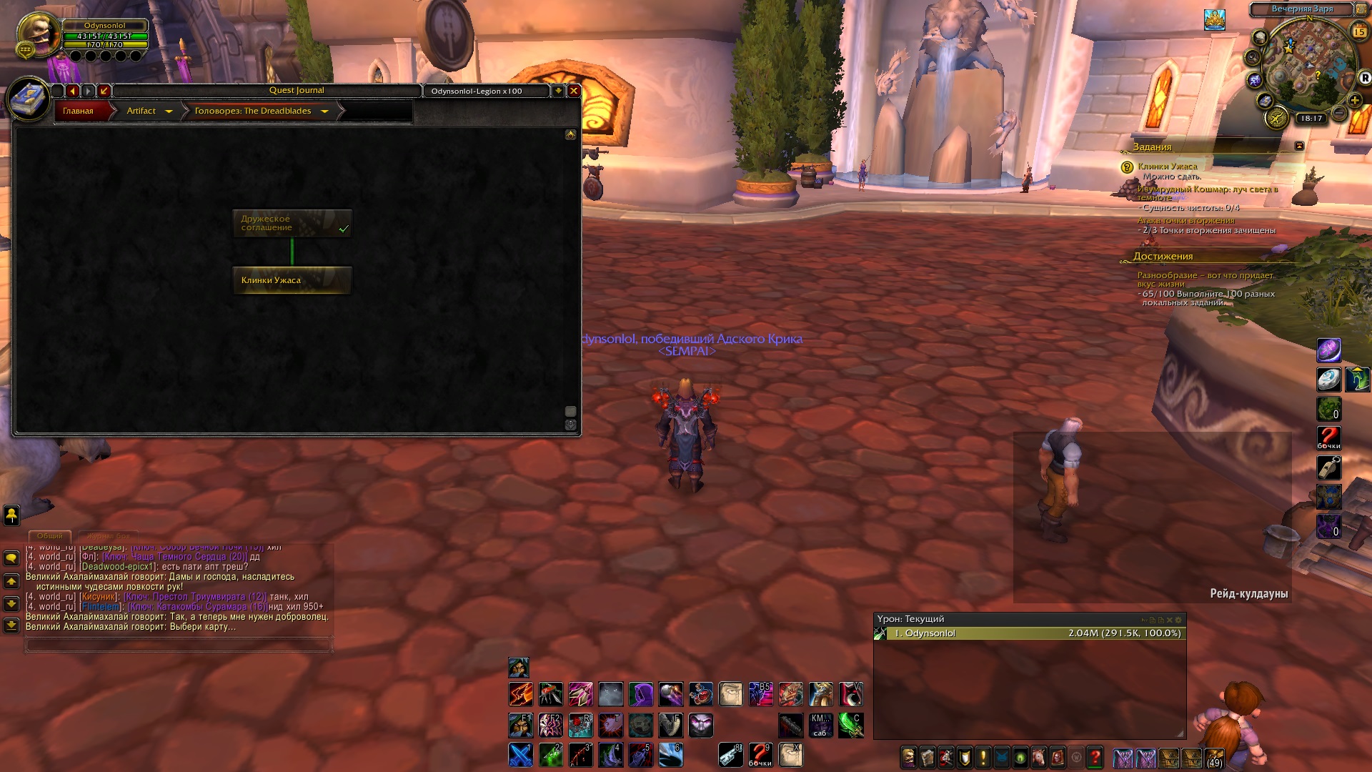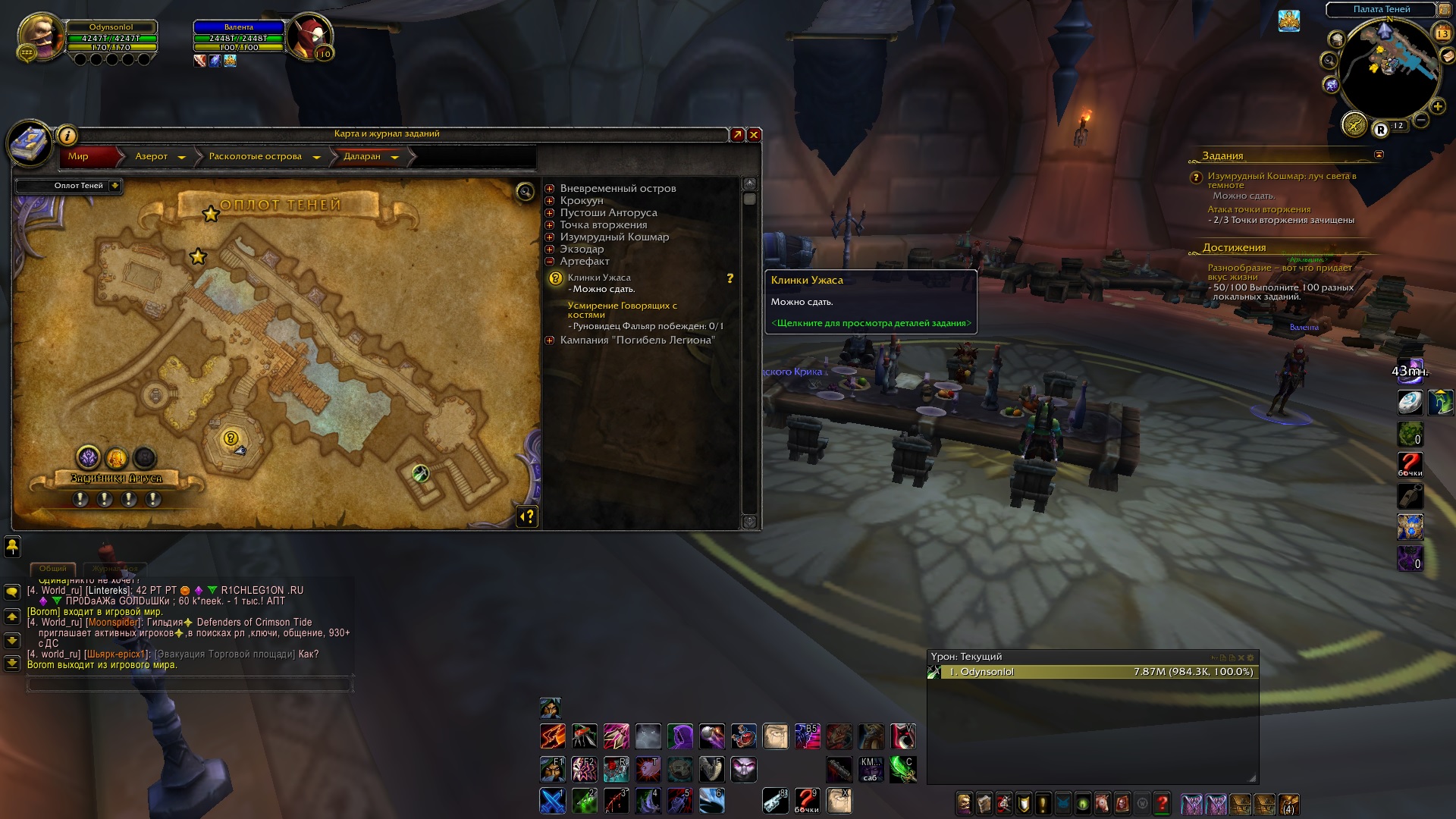 Я же отвечал на все эти вопросы уже, делаю второй артефакт, последний квест который я делал, был https://ru.wowhead.com/quest=40847/дружеское-соглашение, а в данный момент не могу сдать квест "клинки ужаса" |