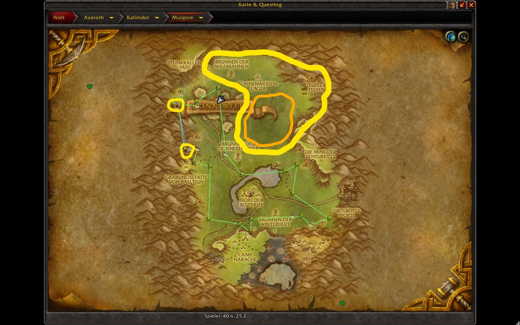 Im gelb markierten Bereich, auf dem Bild, sind keine sammelbaren Pflanzen zu finden. Im orange markierten Bereich sind fast keine Mobs unterwegs. Und in den beiden kleinen gelben Kreisen, links auf der Karte, befinden sich Truhen; allerdings waren diese bisher immer leer. Es konnte nichts gelootet werden. InkedInkedWoWScrnShot_092320_191419_LI.jpg (2,490,588 bytes) |