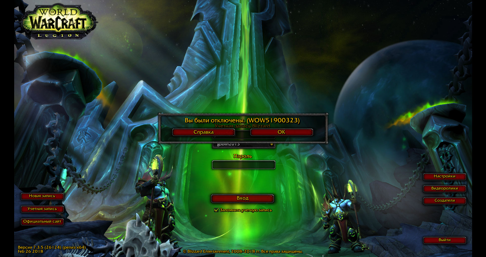| Description | Постоянно вылетает в ключах ошибка (WOW51900323), а особоенно в СВН на двух ластах. Делаю как написано в инструкции на форуме http://f2.uwow.biz/topic/293691-oshibka-wow51900323-wow51900322/ . То есть качаю файлик и добавляю в корневую папку, и после этого игра перестает запускаться совсем. Через лаунчер и через просто клиент открываю, процесс висит в диспетчере, а игра не открывается. | ||||