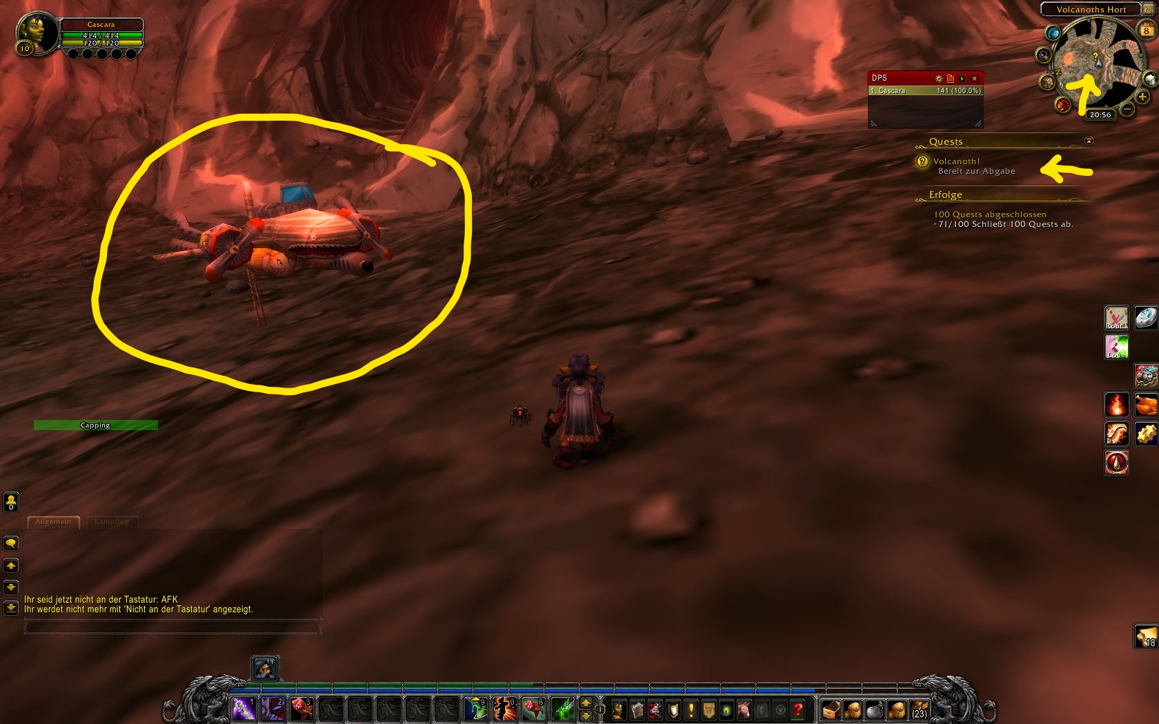 | Steps To Reproduce | Ich habe die Quest "Vulcanoth" #24958 bei Hobart Wurfhammer angenommen. Ich ging dann in den Höhle und tötete Vulcanoth durch Benutzung der "Schuhzooka". Nach dem ich Vulcanoth getötet habe wird mir auf der Map und der Minimap ein ? (Fragezeichen) angezeigt. Leider sehe ich nur eine Flugmaschiene, aber keinen NPC und kein Fragezeichen. Ich kann die Quest daher leider nicht abgeben. Ach nach abbrechen und erneutem starten der Quest erscheint kein NPC zur Abgabe der Quest. Leider ist mein Char so in der Höhle gefangen und kann nirgends mehr hin. | ||||