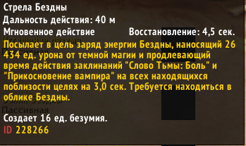 а где модификатор в 1.23 от ауры 137033 ? (так для информации юзаете _scan , там эффект 1 и 2 дают бонус на урон, на каждом билде близзы так регулируют урон спека для всего урона или конкретных способностей) докидываем их в 8140*2,2*1,2=21489 * 1.23 = 26432 (сошлось) 8140*3,1=25234 * 1.23 = 31037 (сошлось) 8140*2,6=21164 * 1.23 = 26032 (сошлось) |