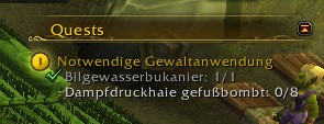 | Description | Bei der Quest "Notwendige Gewaltanwendung" in Kezan (Volk: Goblin) können die "Dampfdruckhaie" nicht weggebomt werden. Ziehlen ist nicht möglich und es werden auch keine "Dampfdruckhaie" getroffen oder gezählt. | ||||