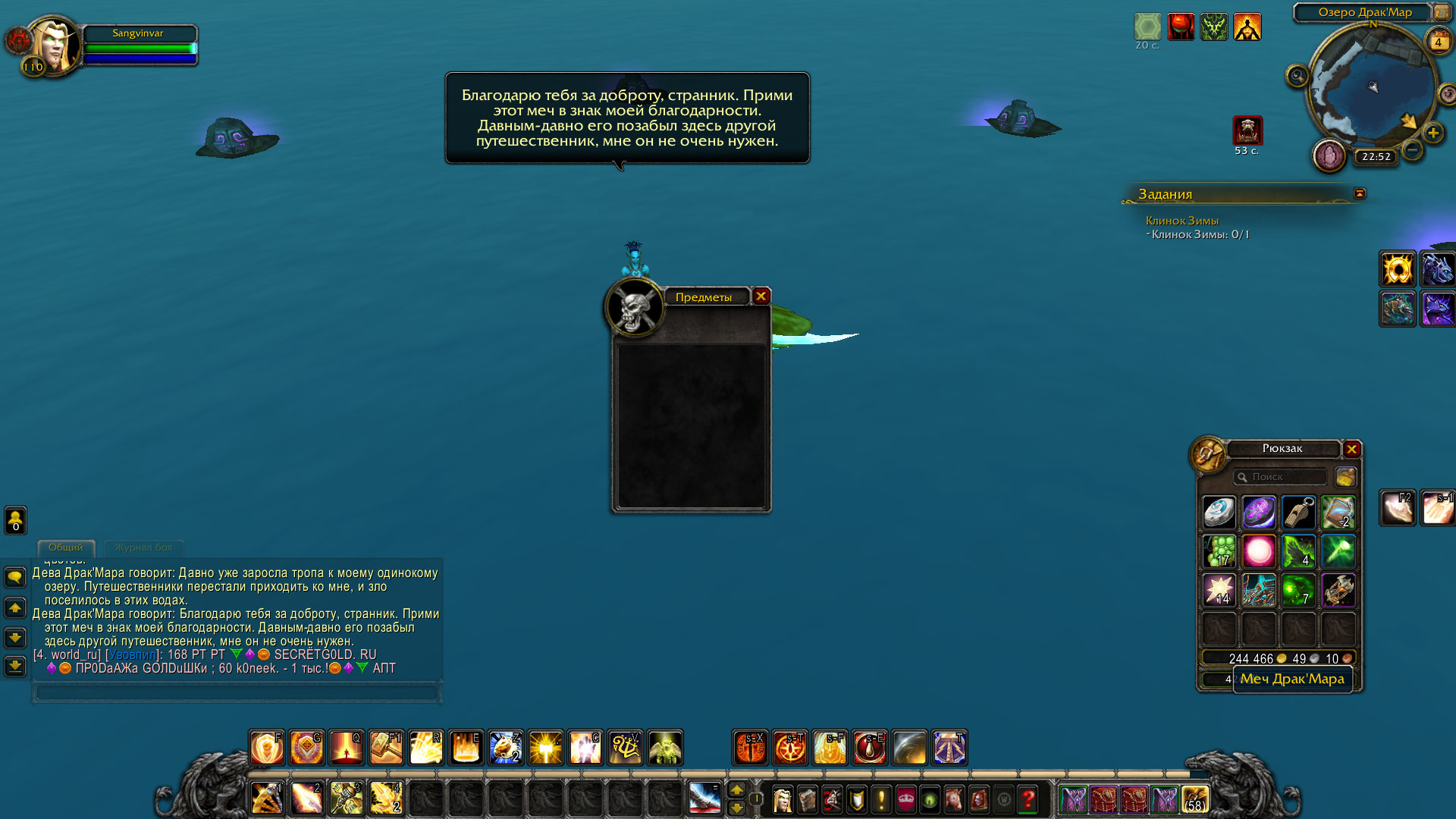 | Description | Персонаж Sangvinvar. орда, x100 Выполнял квест https://ru.wowhead.com/quest=13785/%D0%BA%D0%BB%D0%B8%D0%BD%D0%BE%D0%BA-%D0%B7%D0%B8%D0%BC%D1%8B, НПС когда дает меч, то в нем ничего нет, забагался. Персонажа испралял, кеш чистил, квест отменял и заново брал, не помогает. | ||||