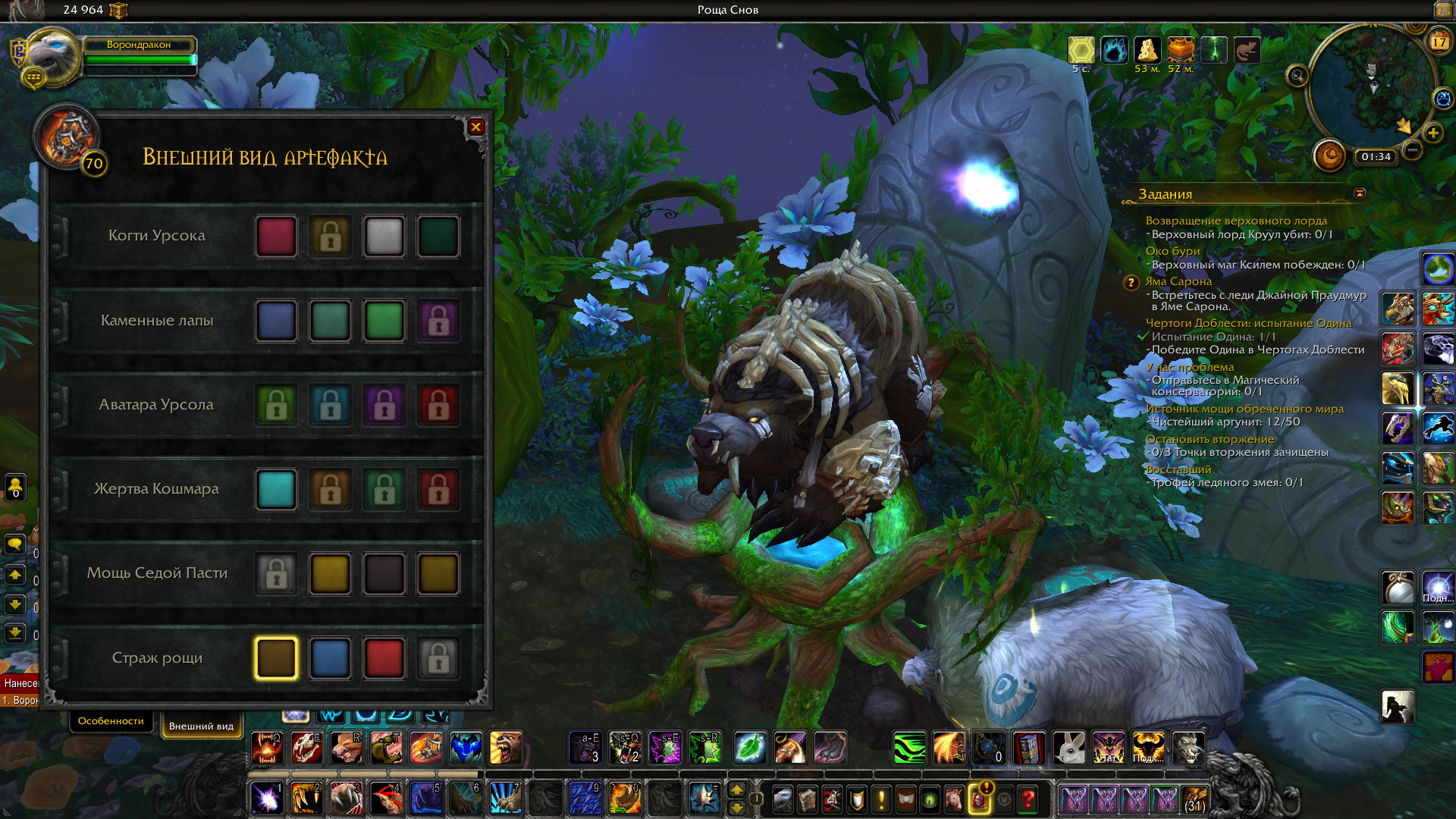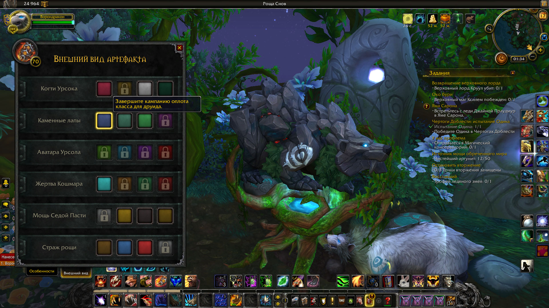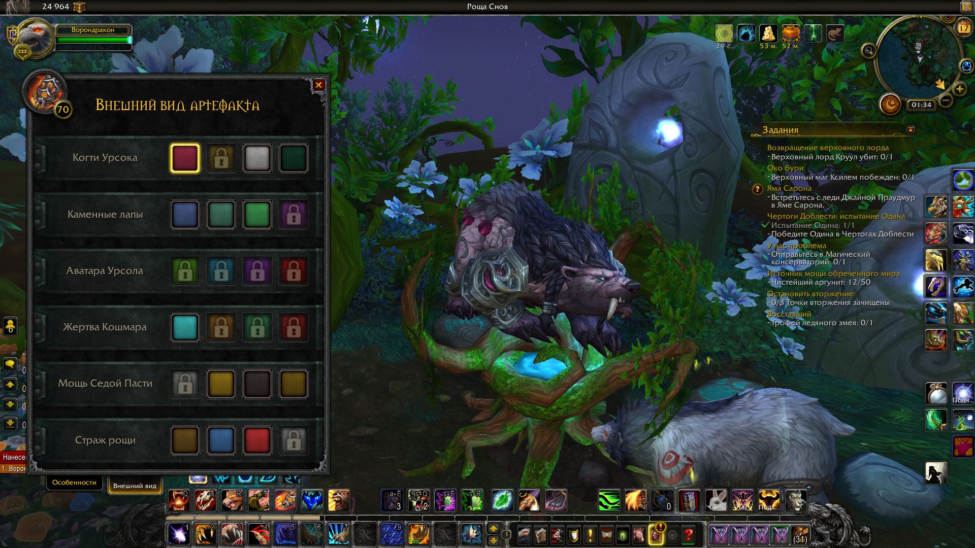 | Description | Персонаж "Ворондракон". Впервые за месяц зашла, сменила специализацию на "Страж" и вместо привычного облика медведя-гориллы увидела облик обычного медведя, который без артефакта. Через стол сменить тоже не получилось, они не сильно меняются. Починка через личный кабинет не помогает. | ||||