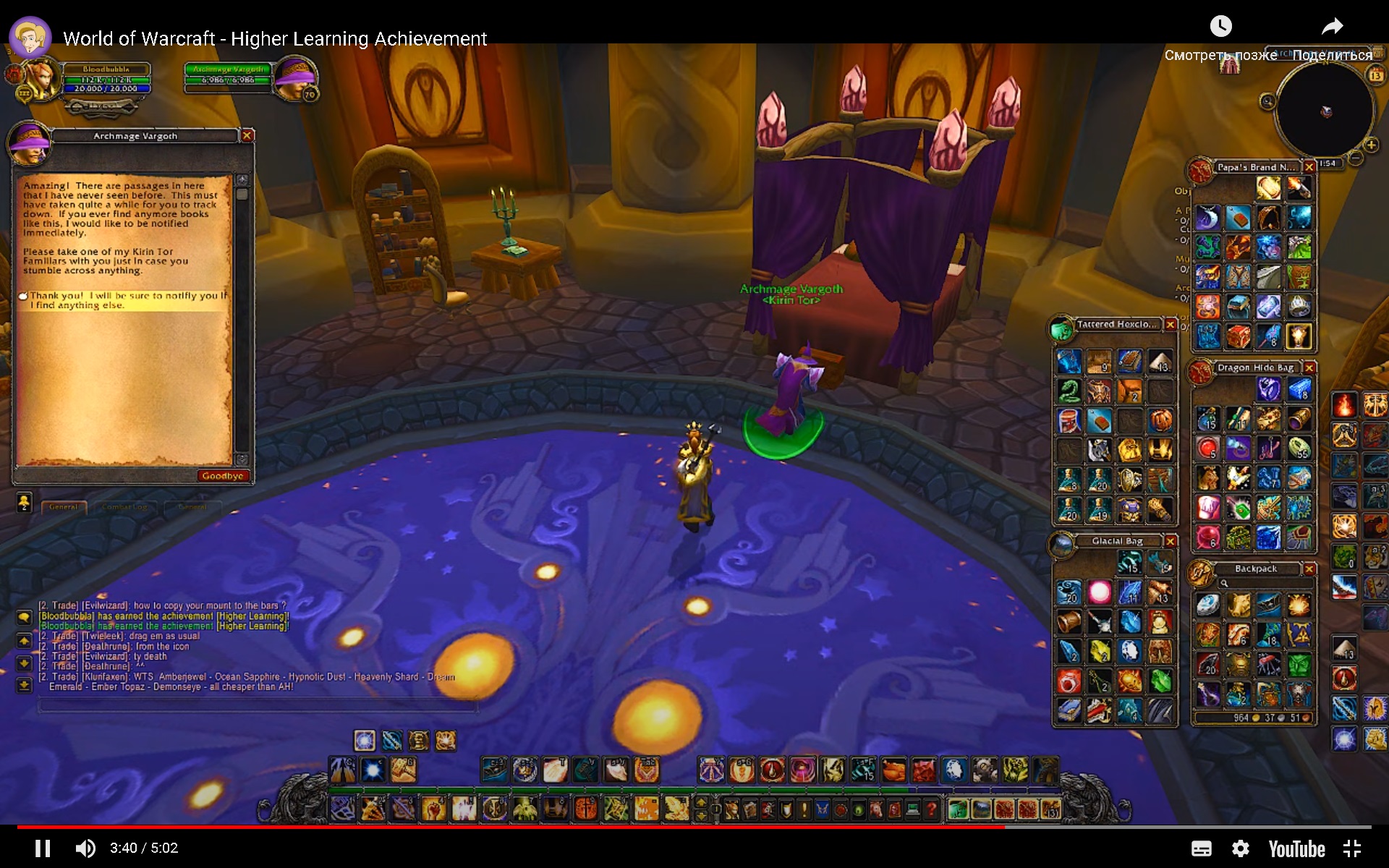| Description | Достижение https://ru.wowhead.com/achievement=1956/%D1%83%D1%87%D0%B5%D0%BD%D1%8C%D0%B5-%D1%81%D0%B2%D0%B5%D1%82#videos:id=4892 подразумевает награды в виде игрушки https://ru.wowhead.com/item=43824/%D1%88%D0%BA%D0%BE%D0%BB%D1%8B-%D1%82%D0%B0%D0%B9%D0%BD%D0%BE%D0%B9-%D0%BC%D0%B0%D0%B3%D0%B8%D0%B8-%D0%BC%D0%B0%D1%81%D1%82%D0%B5%D1%80%D1%81%D1%82%D0%B2%D0%BE - письмо приходит, игрушка работает корректно и питомца https://ru.wowhead.com/item=44738/%D1%84%D0%B0%D0%BC%D0%B8%D0%BB%D0%B8%D0%B0%D1%80-%D0%BA%D0%B8%D1%80%D0%B8%D0%BD-%D1%82%D0%BE%D1%80%D0%B0 - невозможно получить, так как ... после получения достижения и использования прилагаемой игрушки персонаж переносится в закрытые снаружи покои Верховного мага Варгота на вершине АМЦ. Где следует дважды нажать на госсип у нпс. Нпс кастует спелл и в инвентаре персонажа появляется уникальный питомец. У нас госсипы у 19481 отсутствуют, открывается начальное окно диалога без госсипа. Попытки перезачесть достижение, получить пета у дебаггера или Ронина к успеху не привели. Прошу исправить НПС 19481 ( https://ru.wowhead.com/npc=19481/верховный-маг-варгот ) | ||||