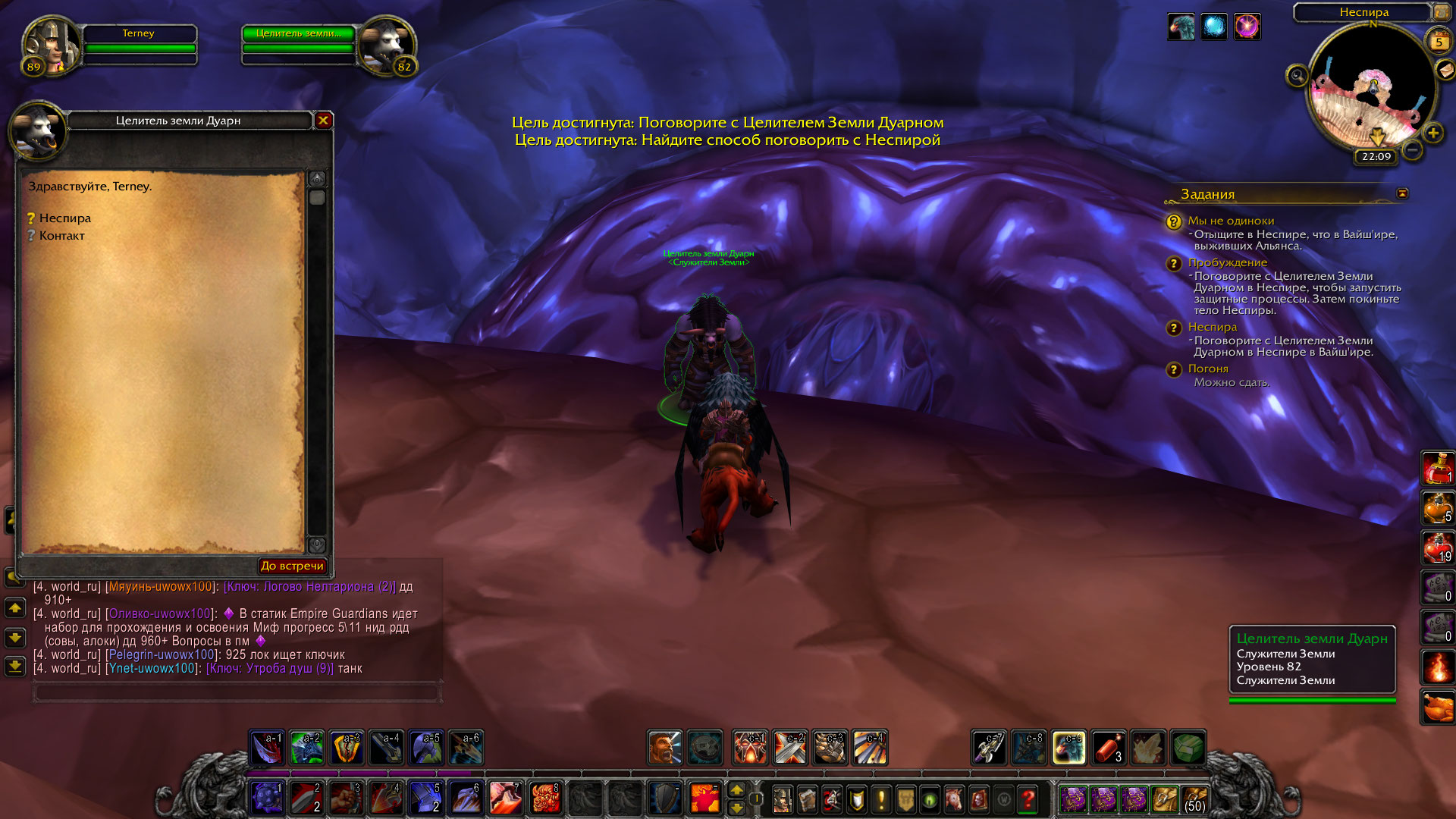 | Description | Пытаюсь сдать квест "Неспира", сдается Дуарну в Неспире. Стою рядом с ним бесконечно сменяются сообщения Цель достигнута "Найдите способ поговорить с Неспирой. Цель достигнута Поговорить с Дуарном, это я так понимаю из квеста "Контакт". Не могу получить награду за квесты | ||||