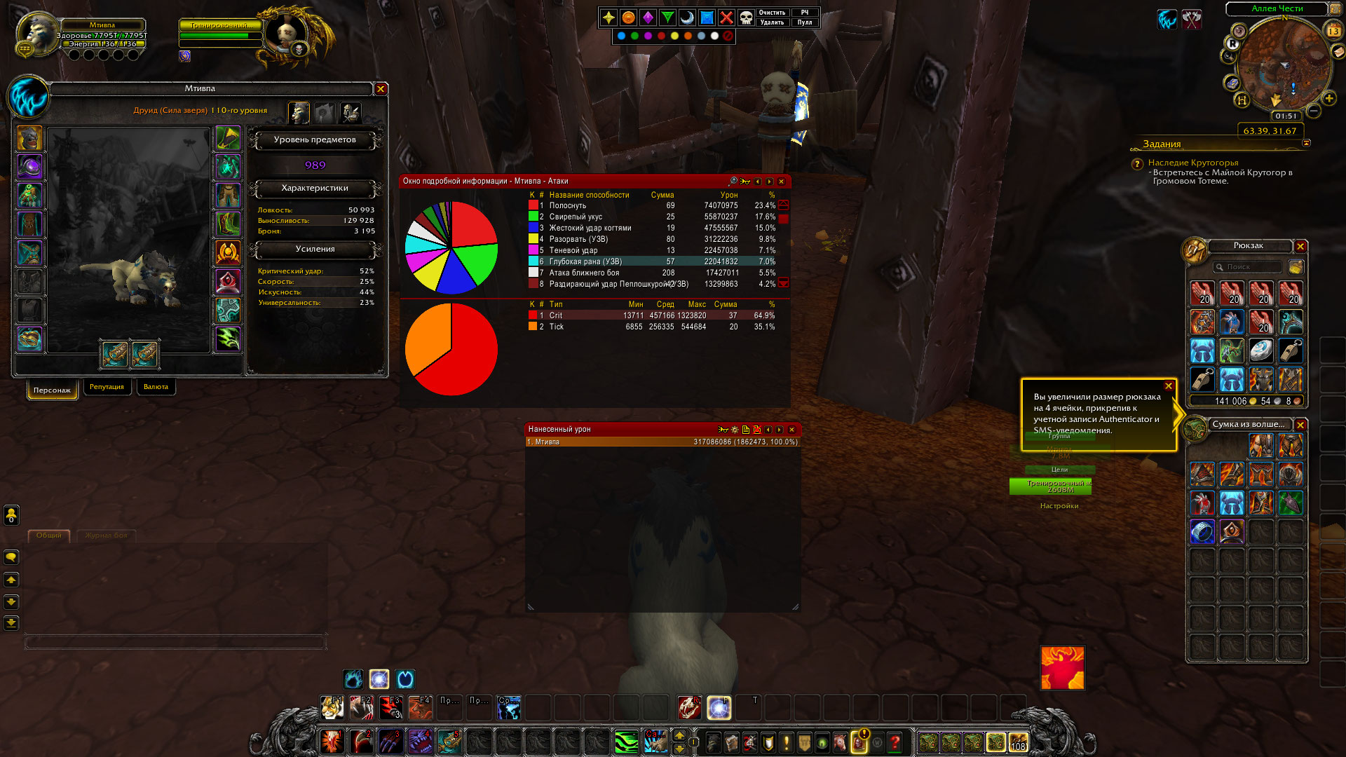 Не перестаете доказывать теорию о том, что люди тут читают только то, что им нужно прочитать. Выше на 3 сообщения посмотри, там все написано. Уважаемый(нет), мистер 1.5 кк 990 ферал. Я по-моему тебе уже ответил и обратился с просьбой скинуть показатели блидов, если ты знаешь, что это такое и также скинуть показатели твоих бруталл слешэй, которые у тебя в 12к крита имеют 70% тут, где это? Потому что даже при собранных 16к крита сейчас, нет даже близко 70%. Говорил он мне, ну я тебе ответил, а вот где твой ответ - хз. Если нечего ответить на это, иди дальше дрочи свою полторашку дпса) |