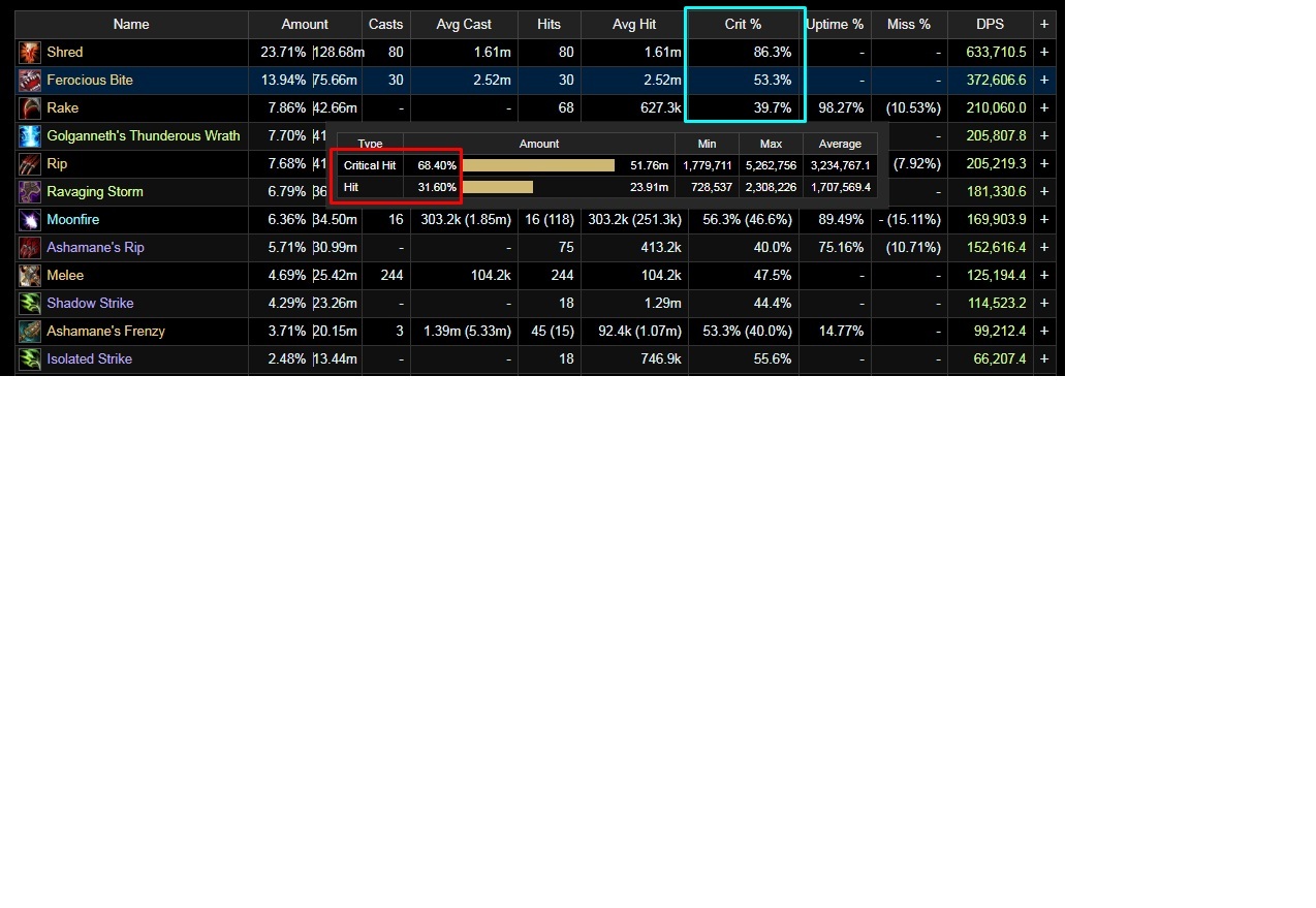 А как крит шанс может быть заниженным если для каждого конкретного вызова спелла он генерируется отдельным броском, к примеру для шреда под инкарной крит будет браться так, в момент нажатия спелла, берем ваш базовый крит и удваиваем его, потом прибавляет мод допустим от перка 210571 (с 4 ранками +20%) потом есть талант 202022, который добавляет еще 10% крита после всех бонусов А сама система броска крита у всех общая, это же тип не классов, а тип всех спеллов. Если бы он был занижен как то, то бы влияло на все классы, где есть в расчетах бонусы усиления шанса крита для некоторых или серий спеллов Так вот, допустим при 33% крита, ваш у вас для шреда будет шанс - 33 * 2 + 20 + 10 = 96% (это как у нас щас) А если крит шанс прибавлять, до удвоения крита (инкарна), то будет (33+20+10)*2 = 126% (крита) вот тут я думаю крит с перка все таки должен даваться после всех удвоений и получится как (33+10)*2 + 20 = 106% (иначе дпс всех классов просто вырастит от того, что их бонусы на увеличение крита конкретных спеллов будут) обсчитываться раньше и это начнут учитывать Раз ты в логах копаться стал, вот тебе и задача, нарыть игроков с разным количеством крита, которые юзают инкарну или могут юзать 202022 потому что разница как видишь в ролле будет существенна в трех ситуациях |