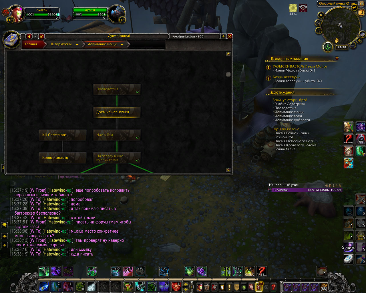 | Description | Баг после рефрака с квестами Древние испытания,и Испытание воли в Штормхейме. До сделанной рефракции ( с Альянса на орду ) начал делать достажение ( Врайкул стори, бро! ) https://ru.wowhead.com/achievement=10790/врайкул-стори-бро. Сделав на альянсе квест ( Древние испытания ) https://ru.wowhead.com/quest=38210/древние-испытания , решил сделать рефракцию,после того как её сделал продолжил,и когда пришёл черед браться за квест ( Испытание воли ) https://ru.wowhead.com/quest=39592/испытание-воли у НПС ( Хави ) https://ru.wowhead.com/npc=96254/хави , его не оказалось. В игровом чате подсказали обратиться сюда. Скрины прилагаю. И извиняюсь если скриншотов очень много. | ||||