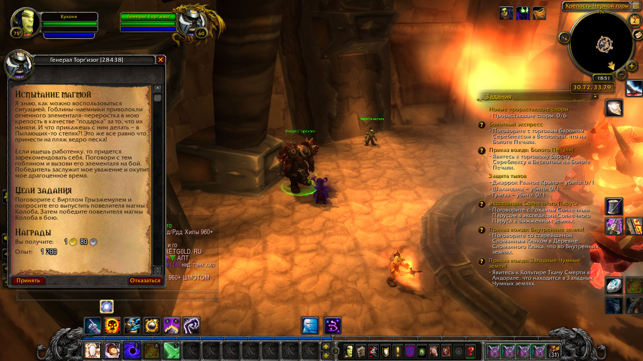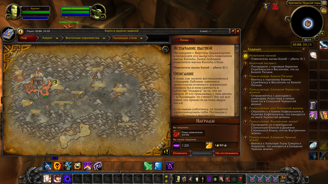 | Description | При прохождении квеста Испытание магмой произошла ошибка. В квесте надо поговорить с нпс , чтобы он разбудил моба, нпс не реагирует. Пробовал все обычные методы, релог, чистка кэша, отменить квест-ничего не помогает. Пробовал снять маскировку и всех перебить, но квестовый моб не агрится. | ||||