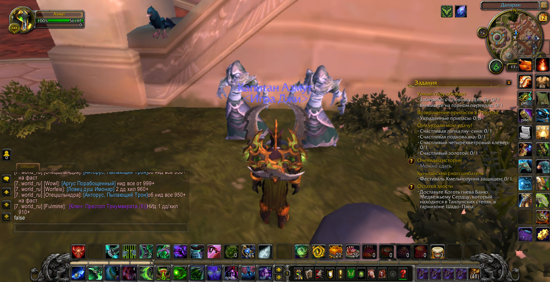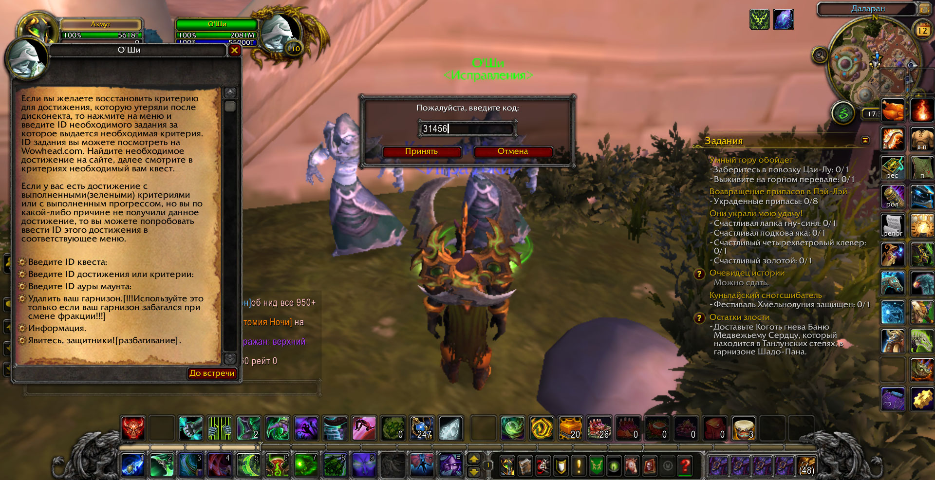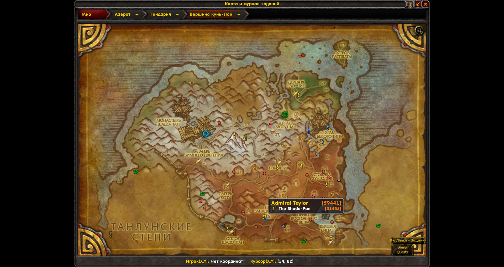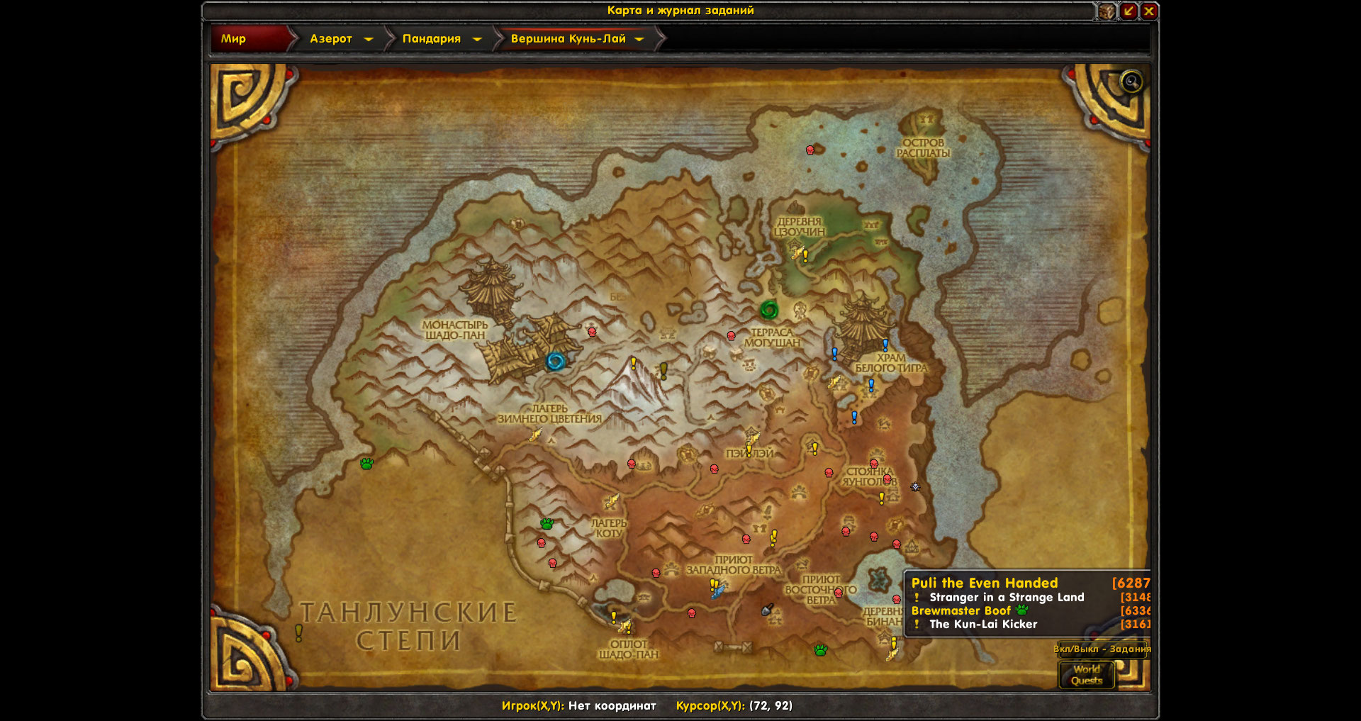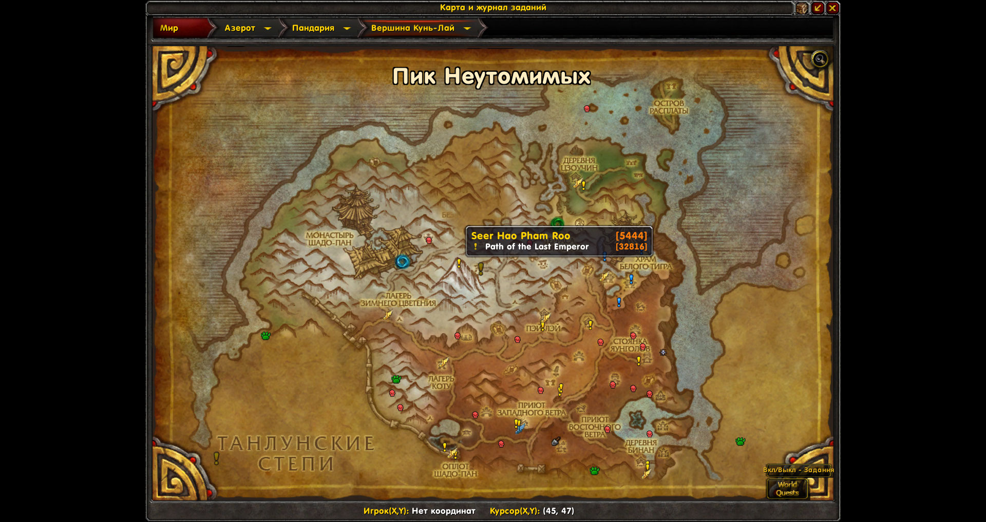 И ещё,аддон показывает на карте невыполненные квесты 30611(сценарий-не реализован),30682,30665,31455,31460,30492,30999,30601,30945,32816.Значки квестов на карте есть,но по факту в локации доступные квесты отсутствуют.Ниже скрины с картой WoWScrnShot_022021_025954.jpg (384,787 bytes) WoWScrnShot_022021_030331.jpg (388,758 bytes) WoWScrnShot_022021_030354.jpg (391,186 bytes) WoWScrnShot_022021_030510.jpg (379,595 bytes) WoWScrnShot_022021_030514.jpg (378,341 bytes) WoWScrnShot_022021_030553.jpg (387,875 bytes) WoWScrnShot_022021_030649.jpg (383,156 bytes) WoWScrnShot_022021_030653.jpg (380,925 bytes) WoWScrnShot_022021_030835.jpg (384,734 bytes) |